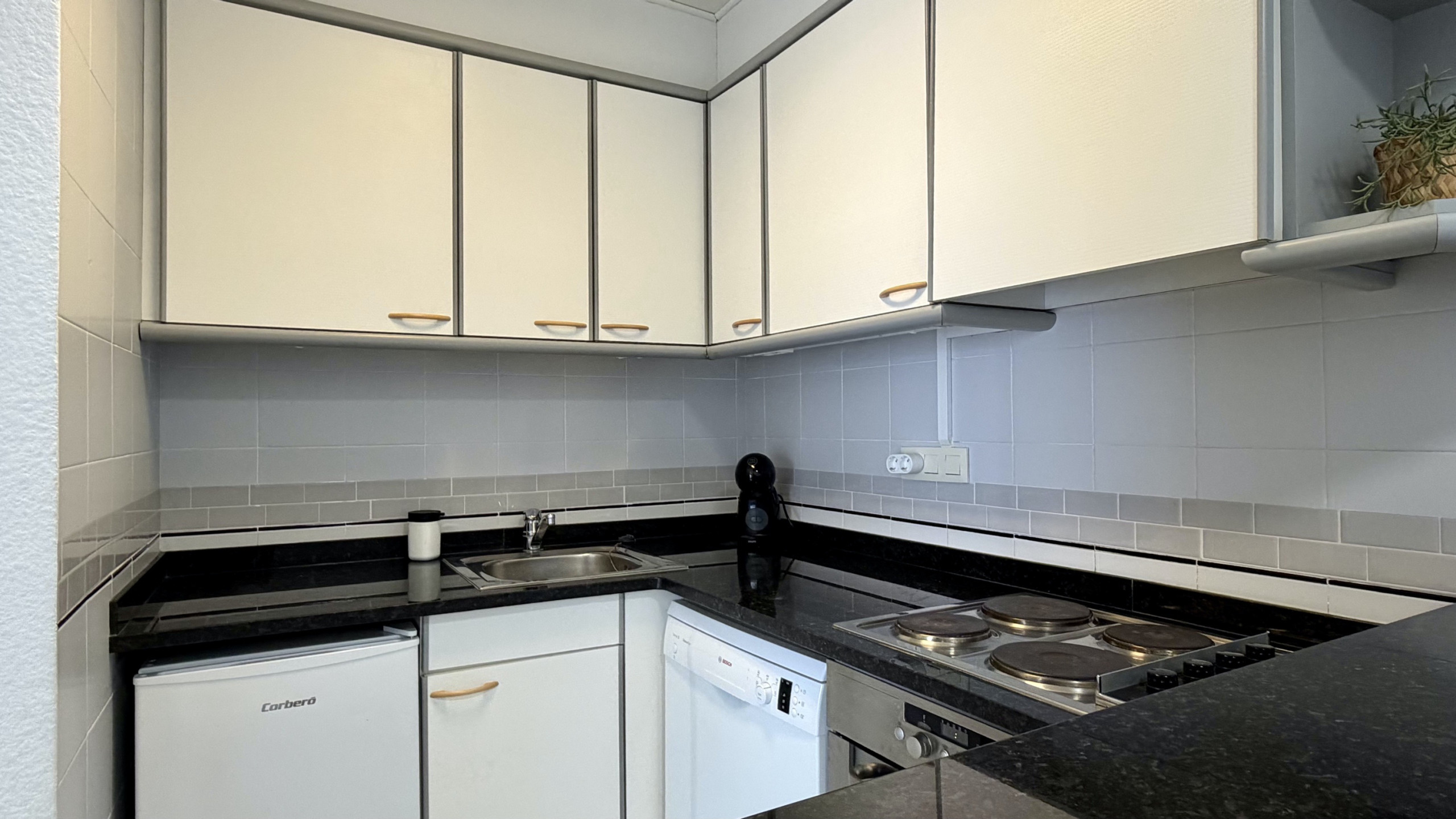 En la cocina americana eléctrica, descubra todo lo imprescindible para sus necesidades culinarias, incluyendo frigorífico, microondas, horno, congelador, lavadora, vajilla/cubertería, utensilios de cocina, cafetera, tostadora y exprimidor.