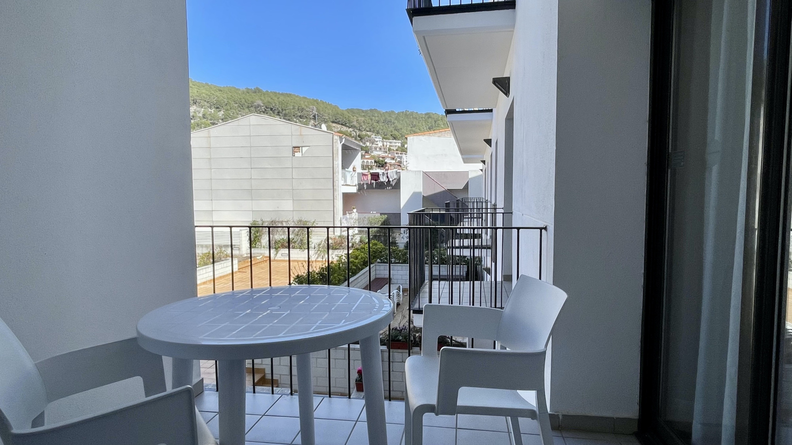 El apartamento tiene una gran terraza con una inmejorable vista del todo el complejo Rocamaura, con la piscina a tus pies y las Islas Medes de fondo.
