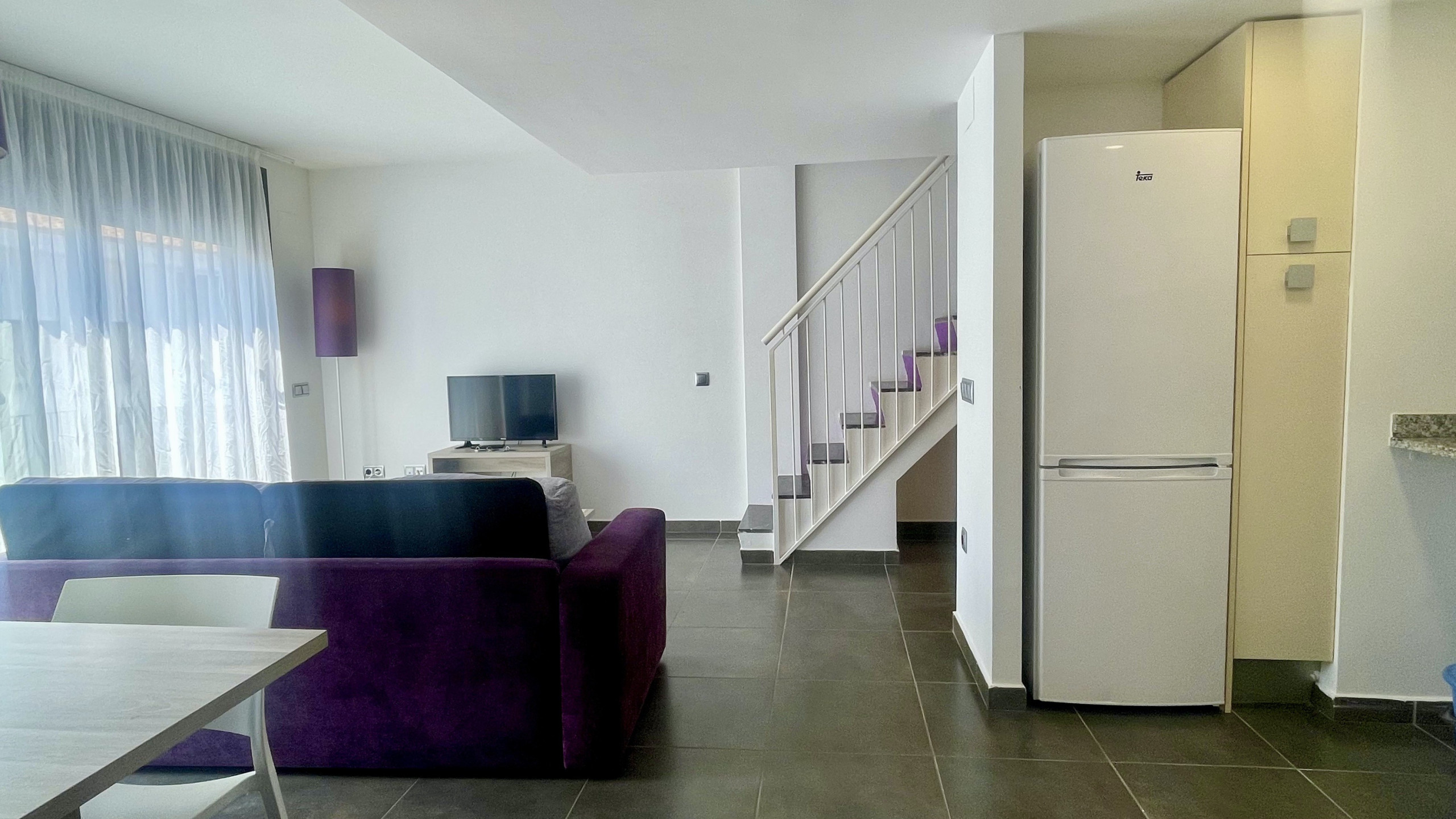 El apartamento se distribuye en dos plantas y cuenta con tres dormitorios cómodos y funcionales, así como dos baños completos que aportan comodidad a grupos más grandes. Los espacios son amplios y bien aprovechados, con una decoración sencilla y práctica que invita al descanso. La cocina está equipada con todo lo necesario para disfrutar de estancias largas o cortas.