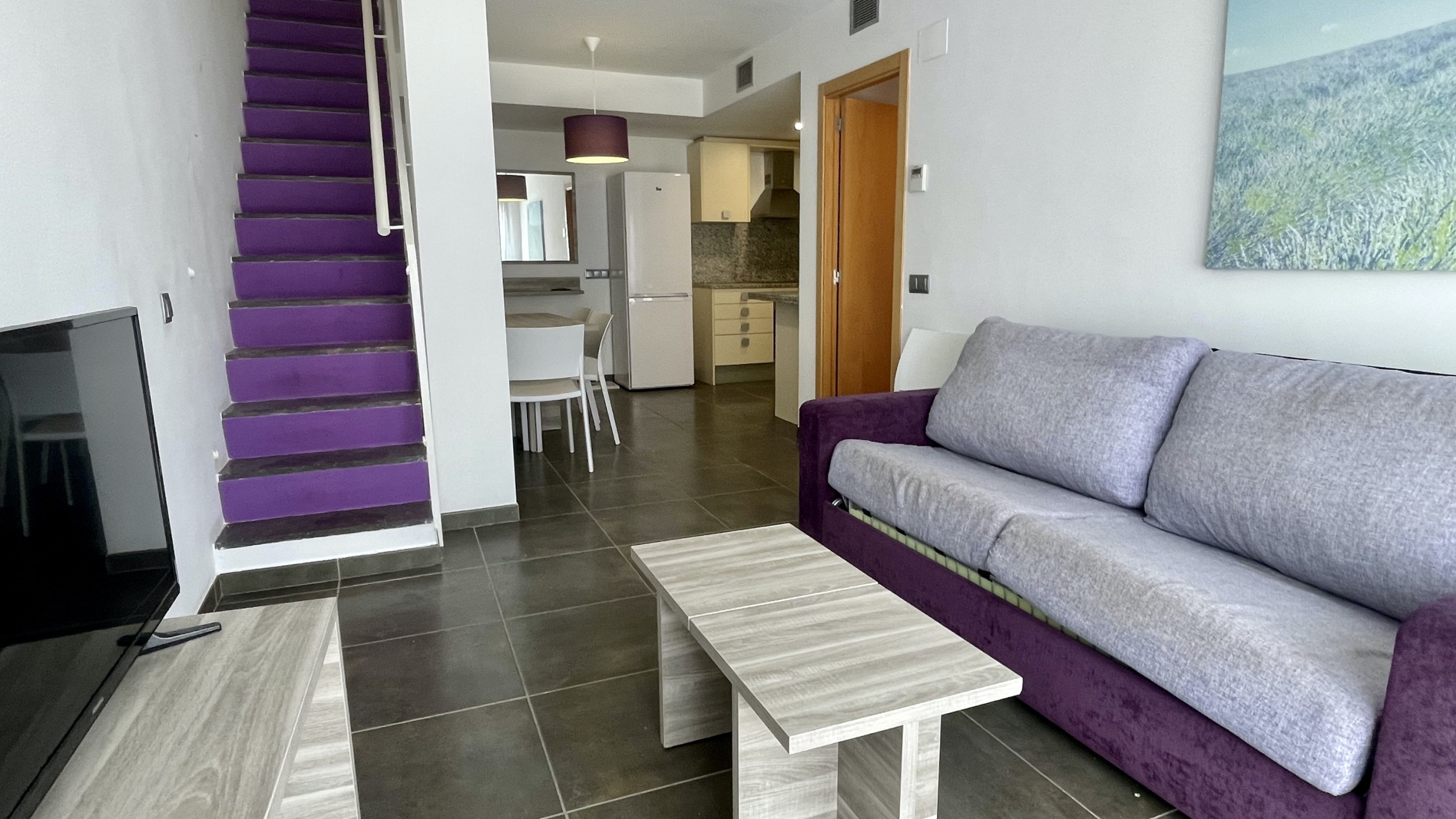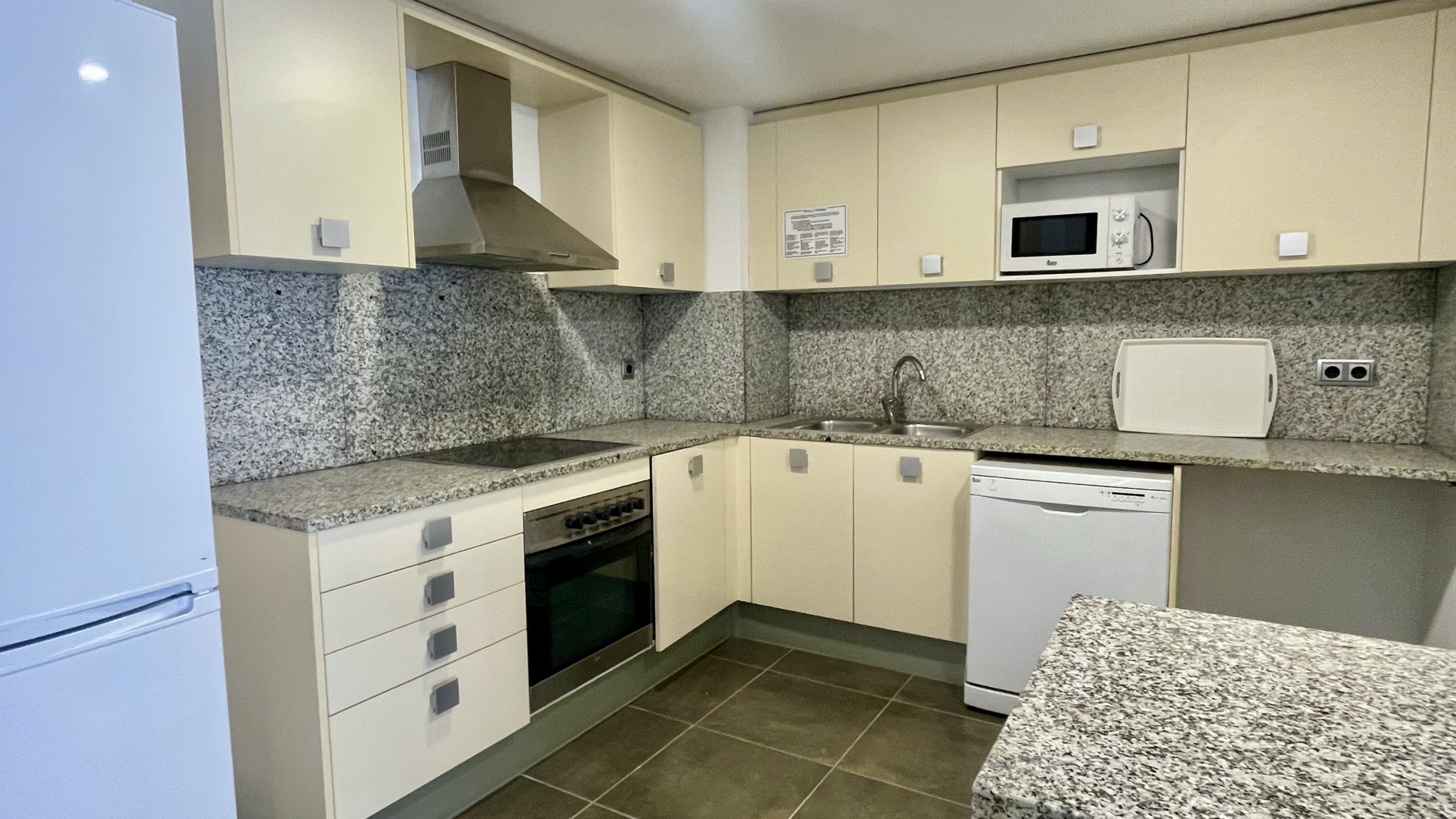 La cocina americana está totalmente equipada con electrodomésticos modernos, incluyendo nevera, congelador, lavavajillas, horno, microondas, cafetera y una amplia variedad de menaje y utensilios de cocina. Esto permite preparar comidas deliciosas y disfrutar de momentos gastronómicos en familia.
