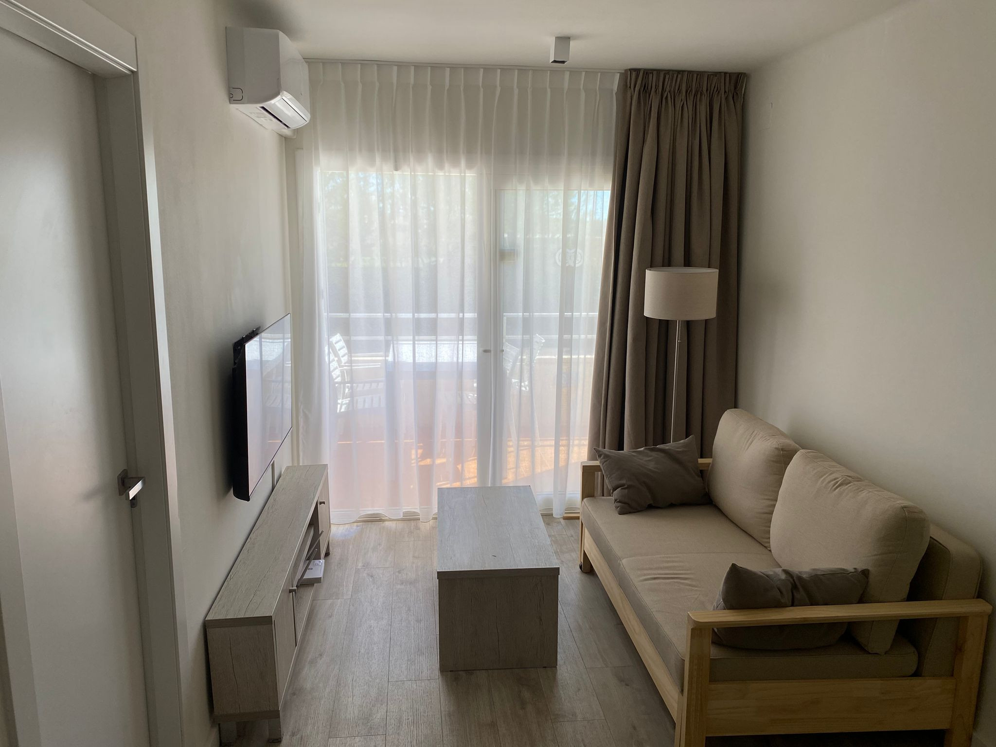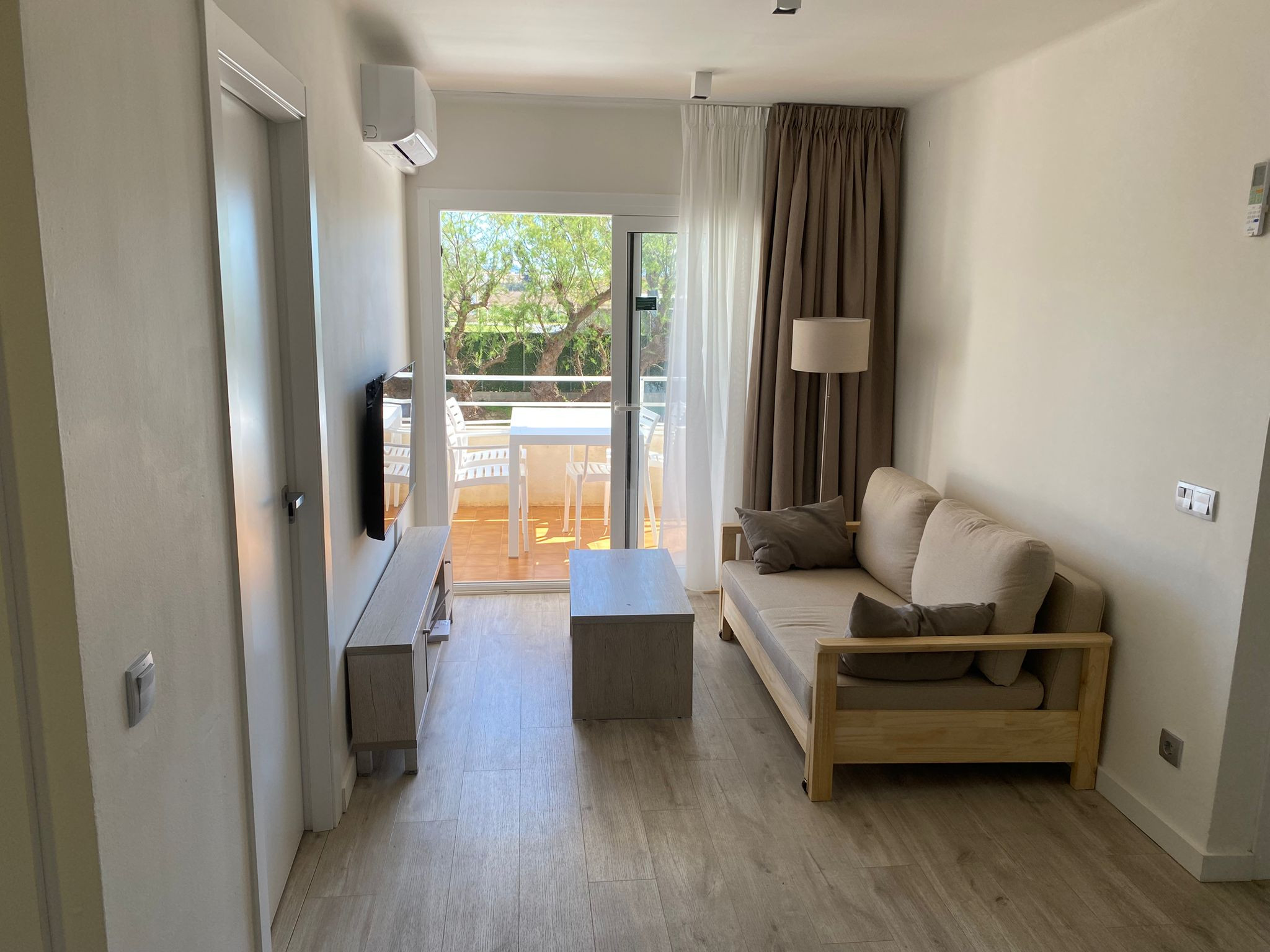 El apartamento ofrece todas las comodidades para una estancia confortable. Destaca su cocina americana completamente equipada con electrodomésticos como nevera, lavadora, lavavajillas, microondas, tostadora y máquina de café. La zona de estar incluye televisión y aire acondicionado con bomba de calor para garantizar tu confort en cualquier época del año.