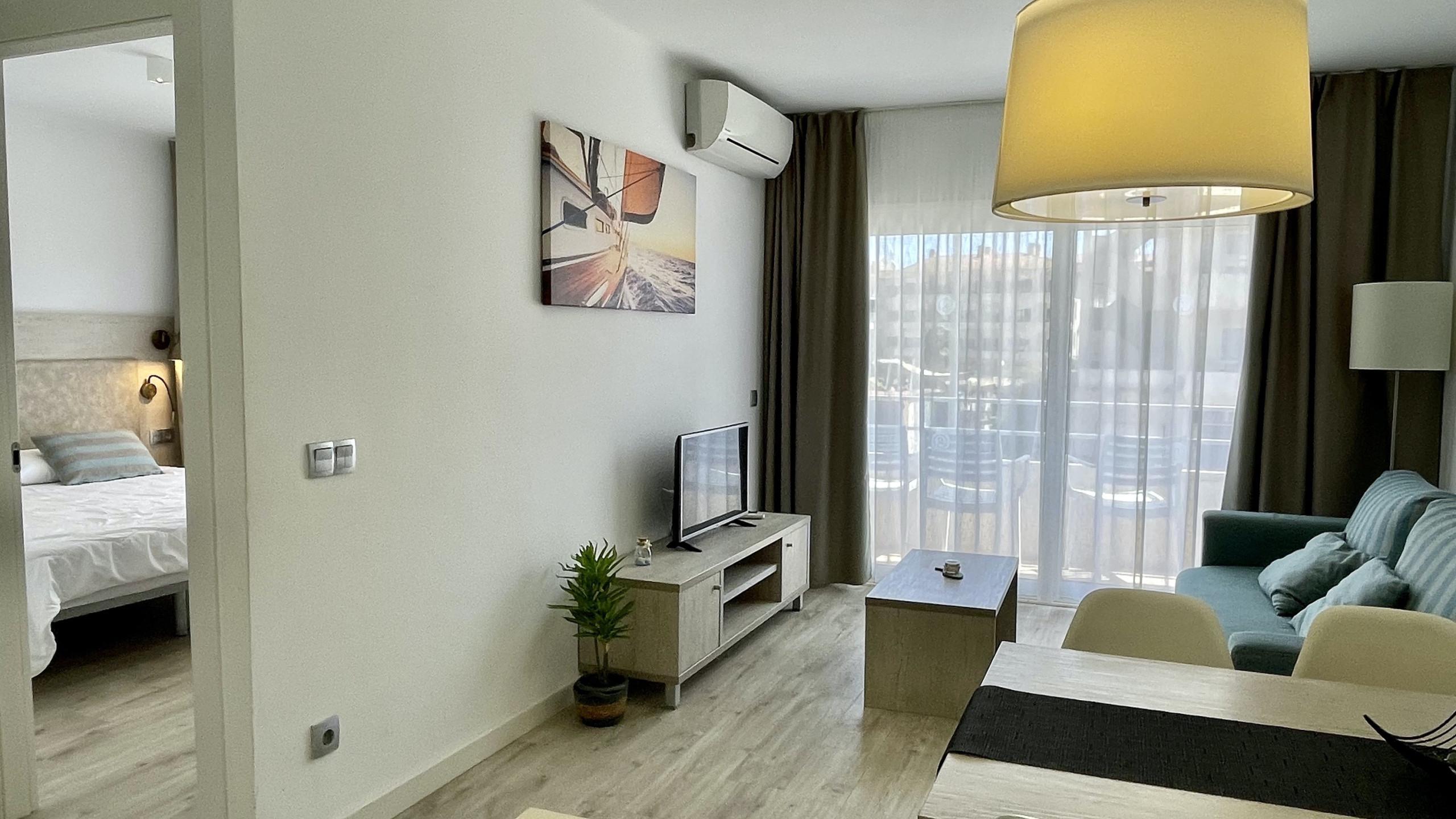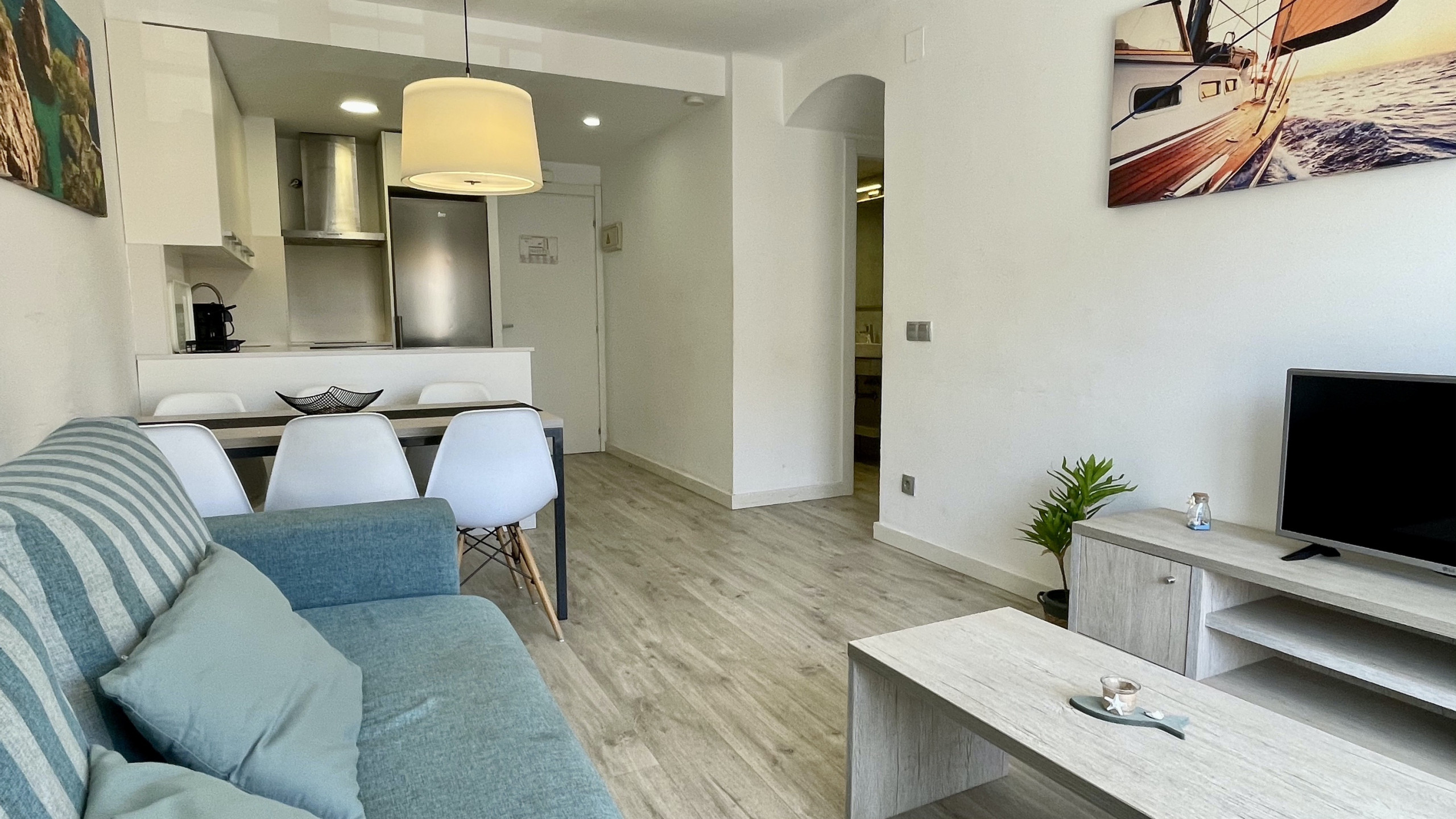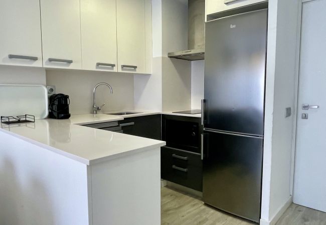 El apartamento cuenta con aire acondicionado para mantener un ambiente fresco durante los días más calurosos, ideal para familias con niños. La cocina americana está completamente equipada con electrodomésticos modernos como nevera, congelador, lavavajillas, microondas, tostadora y máquina de café, facilitando la preparación de comidas y snacks para toda la familia.