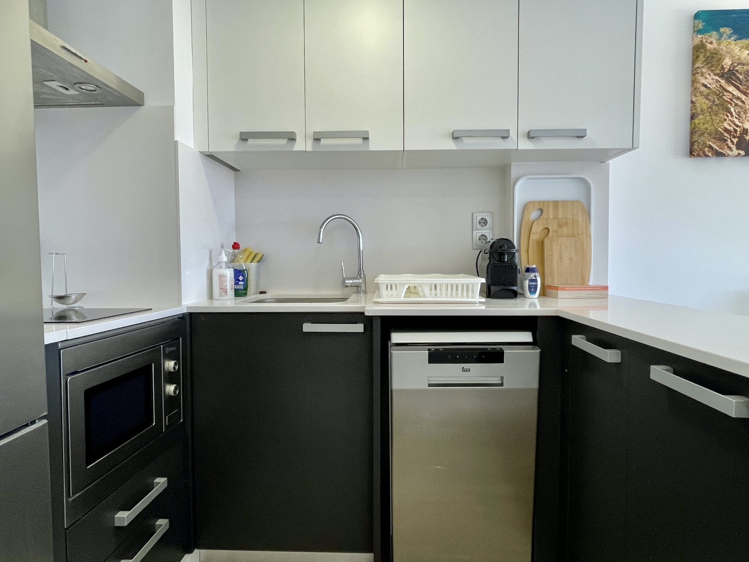 La cocina americana, equipada con sistema de cocción de vitrocerámica, está completamente equipada con los electrodomésticos esenciales, como frigorífico, microondas, congelador, lavadora, lavavajillas, además de vajilla, cubertería, utensilios de cocina, cafetera y tostadora.