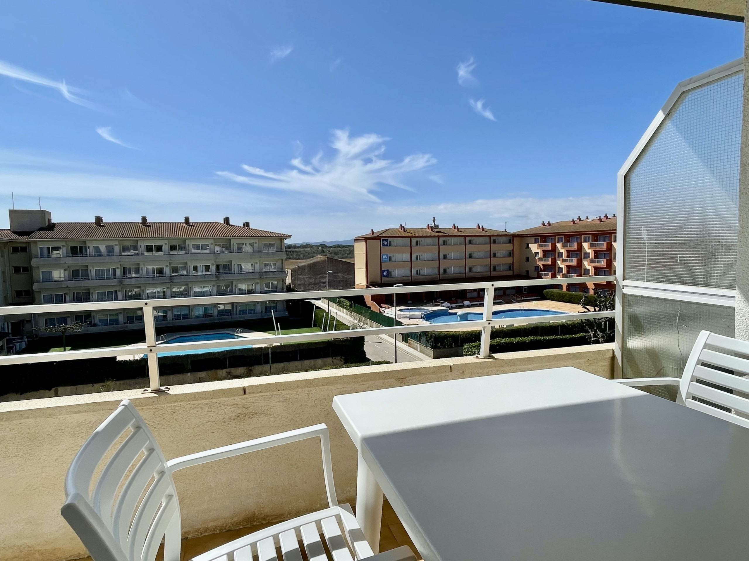 El apartamento tiene una gran terraza con una inmejorable vista del todo el complejo Rocamaura, con la piscina a tus pies y las Islas Medes de fondo.