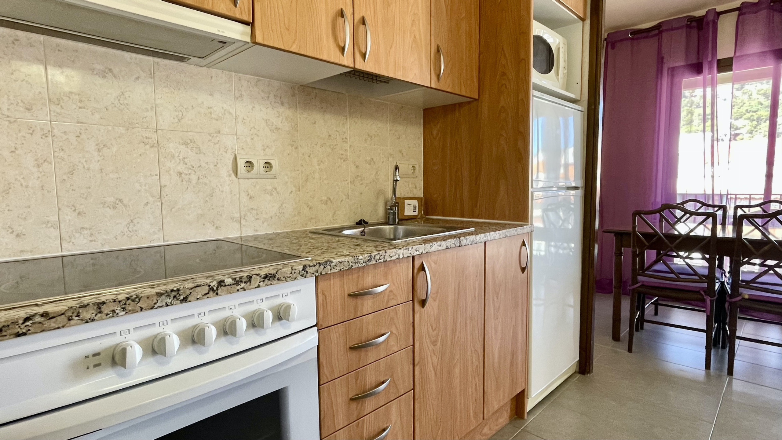 La cocina americana, de vitrocerámica, está totalmente equipada con frigorífico, microondas, horno, congelador, lavadora y todo el menaje de cocina, como vajilla, cubertería, utensilios de cocina, cafetera, tostadora y exprimidor.
