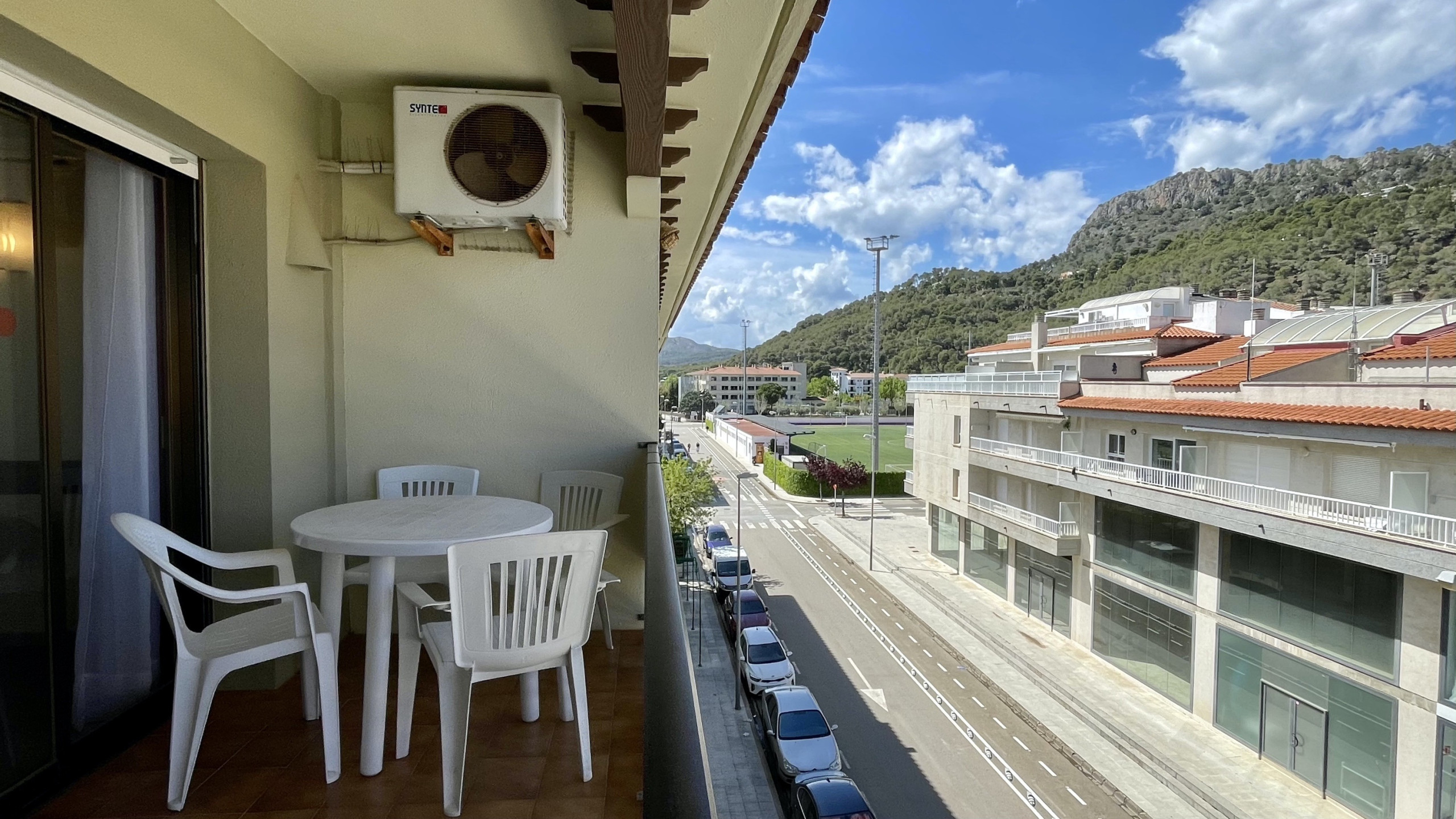 El apartamento tiene una gran terraza con una inmejorable vista del todo el complejo Rocamaura, con la piscina a tus pies y las Islas Medes de fondo.
