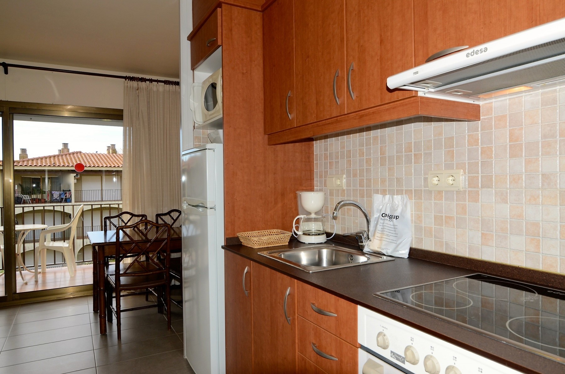 En la cocina americana con vitrocerámica encontrarás frigorífico, microondas, horno, congelador, lavadora, vajilla, cubertería, utensilios de cocina, cafetera, tostadora y exprimidor.
