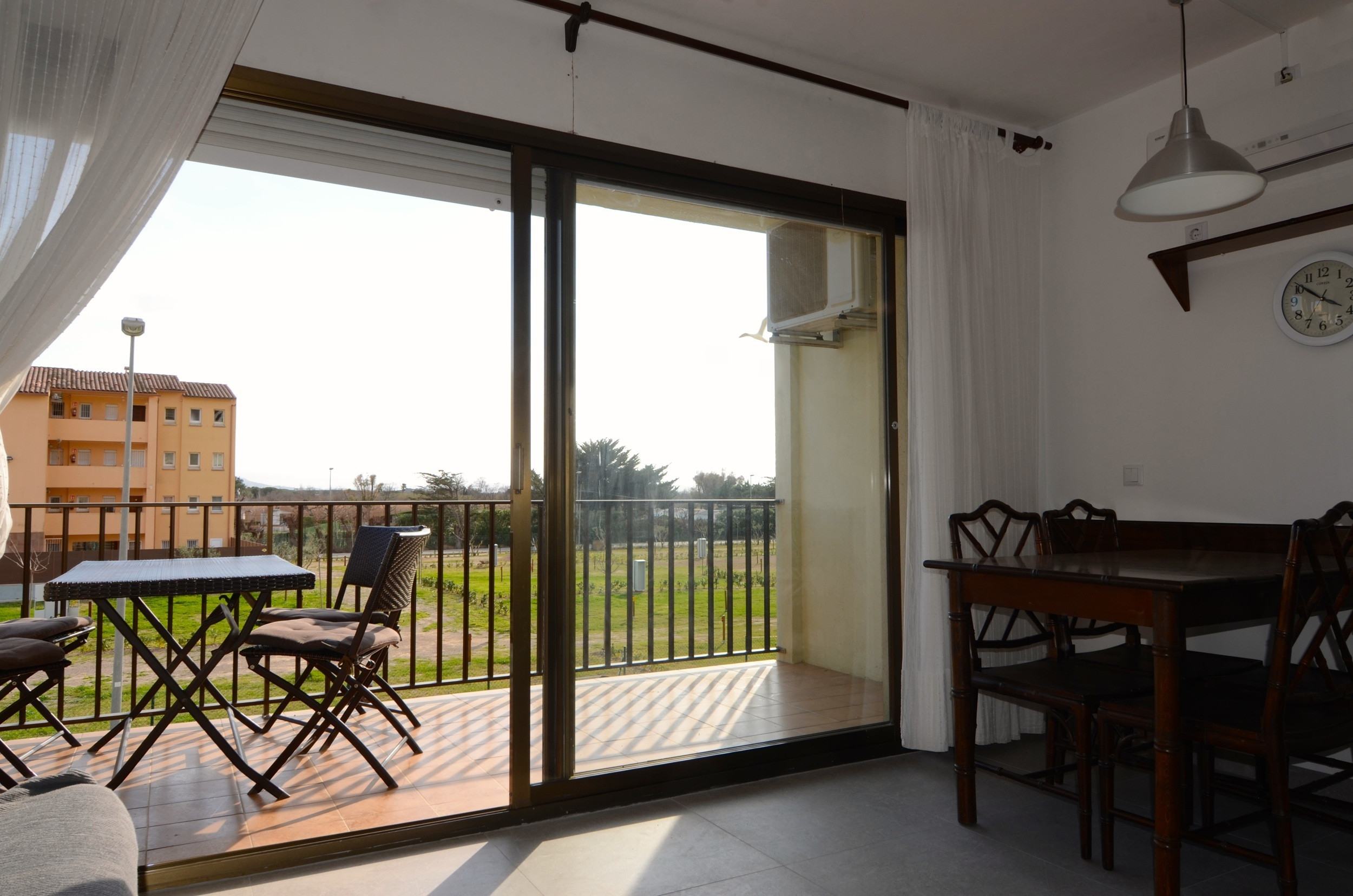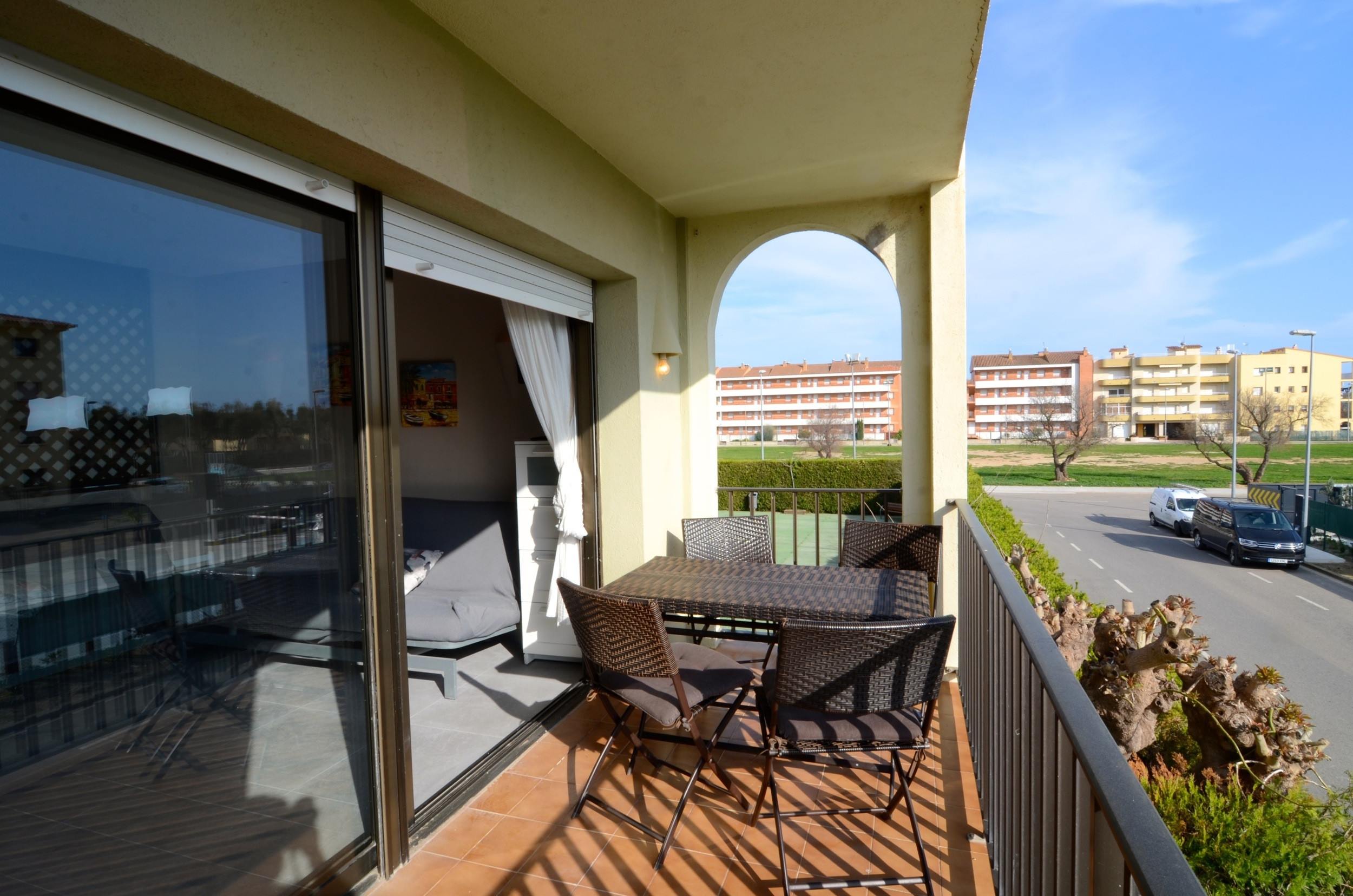 El apartamento tiene una gran terraza con una inmejorable vista del todo el complejo Rocamaura, con la piscina a tus pies y las Islas Medes de fondo.