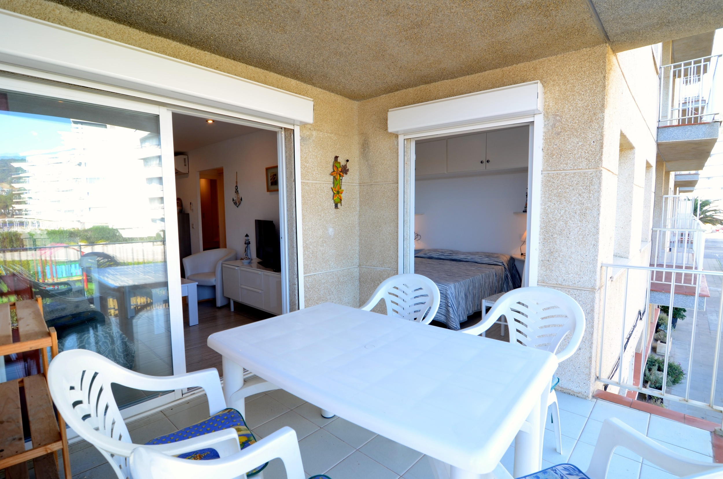 El apartamento tiene una gran terraza con una inmejorable vista del todo el complejo Rocamaura, con la piscina a tus pies y las Islas Medes de fondo.