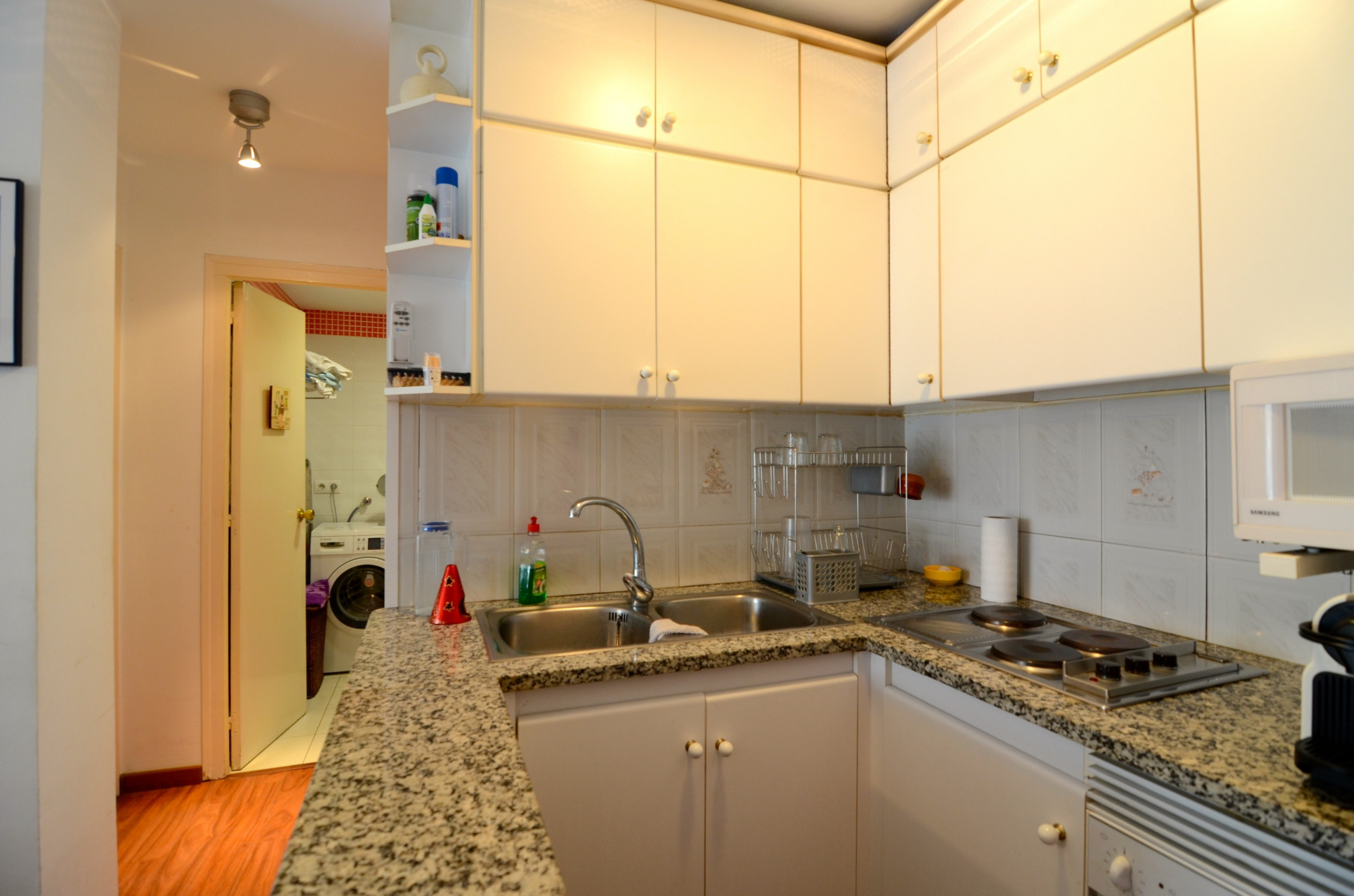 La cocina americana eléctrica incluye frigorífico, microondas, horno, congelador, lavadora, vajilla/cubertería, utensilios/cocina, cafetera, tostadora y exprimidor.