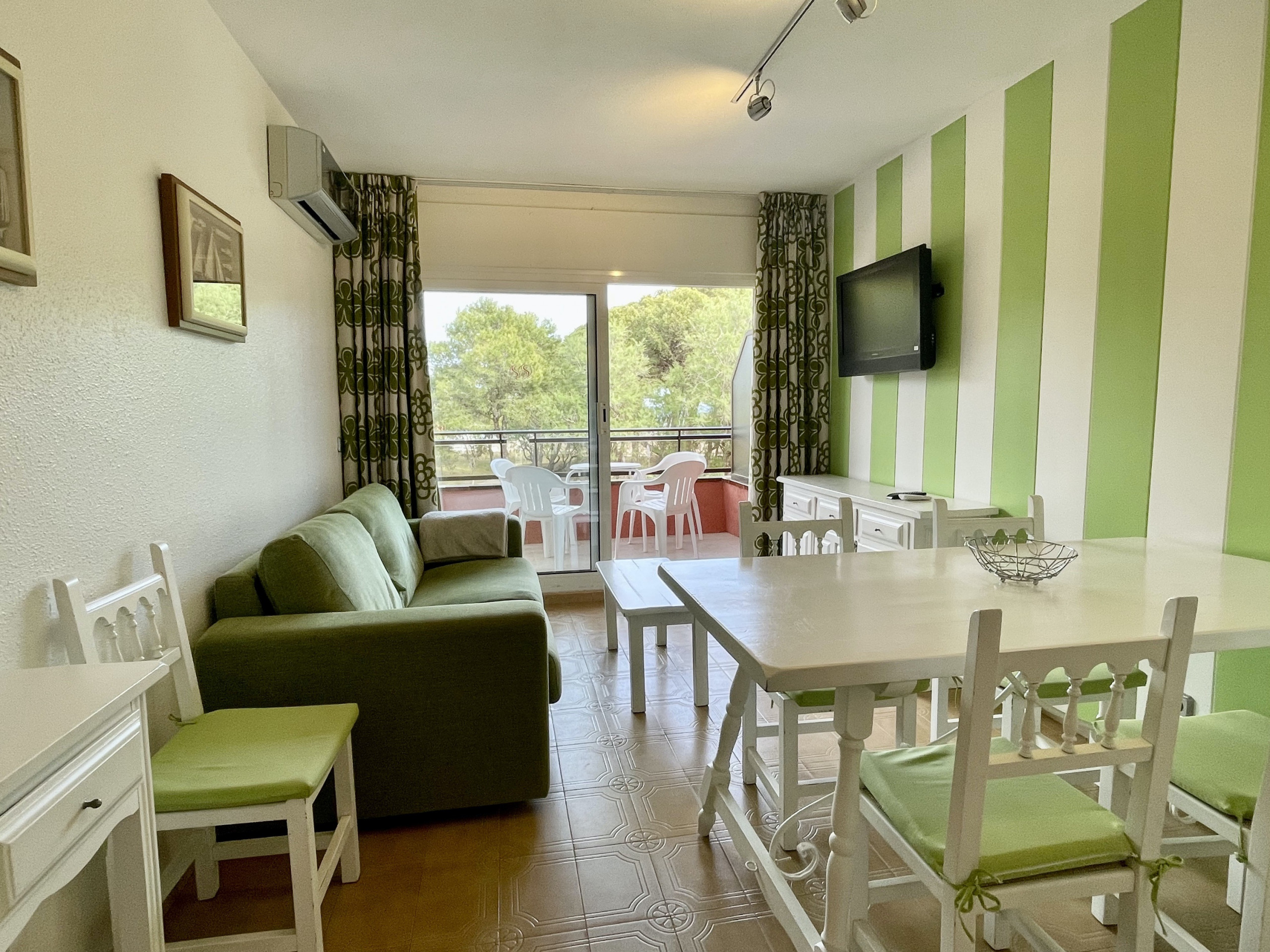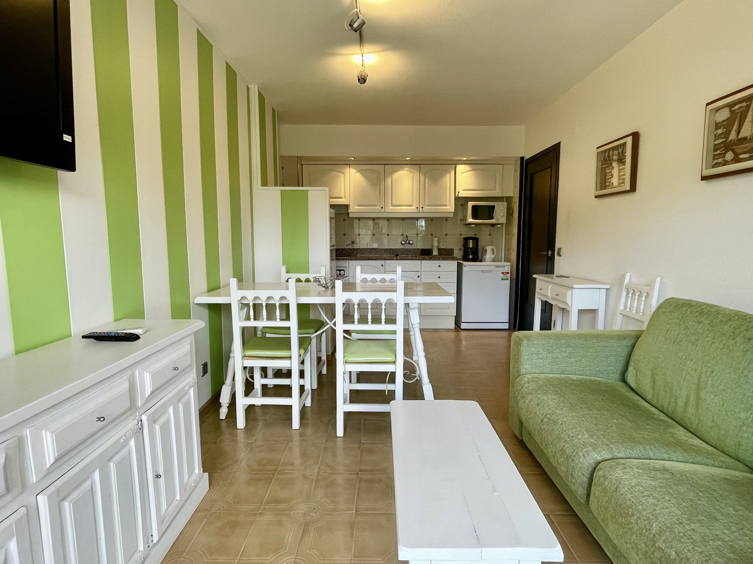 El apartamento cuenta con un dormitorio y un baño, además de una cocina americana totalmente equipada que incluye nevera, microondas, horno, congelador, lavadora, lavavajillas, vajilla/cubertería, utensilios de cocina, cafetera y tostadora. La sala de estar es acogedora y está equipada con un televisor y aire acondicionado. La terraza del apartamento es perfecta para disfrutar de una taza de café o una comida al aire libre. Las sabanas estan incluidas y si necesita toallas de baño estan disponibles a 5 euros/persona.