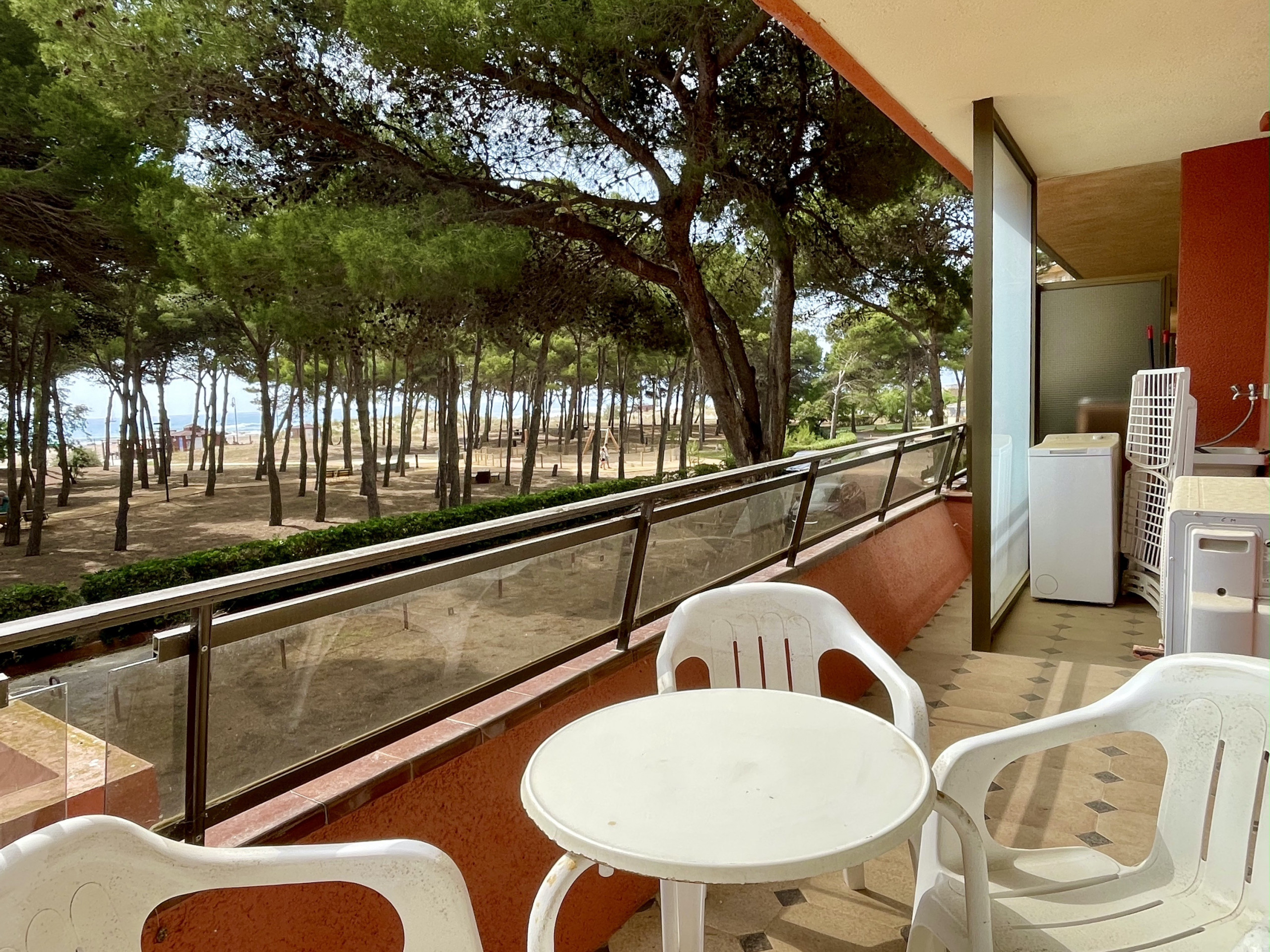 El apartamento tiene una gran terraza con una inmejorable vista del todo el complejo Rocamaura, con la piscina a tus pies y las Islas Medes de fondo.