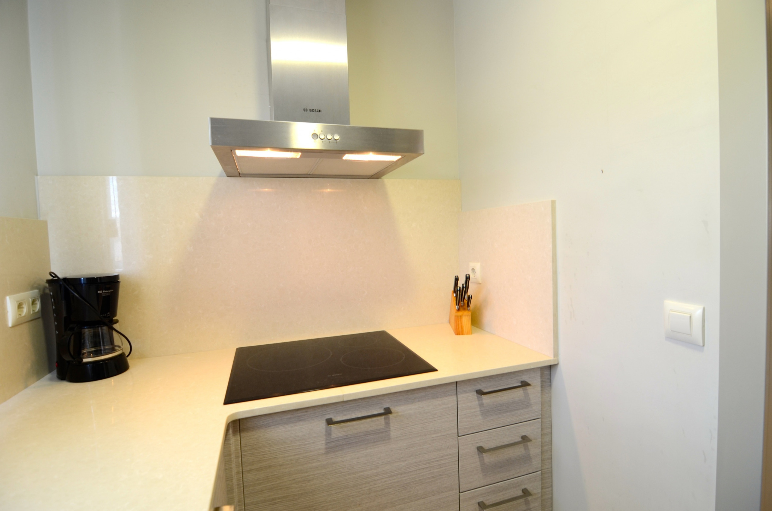 La cocina americana está completamente equipada con electrodomésticos modernos como nevera, lavadora, microondas, cafetera, tostadora y menaje completo. Ideal para preparar comidas y desayunos durante tu estancia. Además, cuenta con conexión WiFi y televisión para mantenerte entretenido.