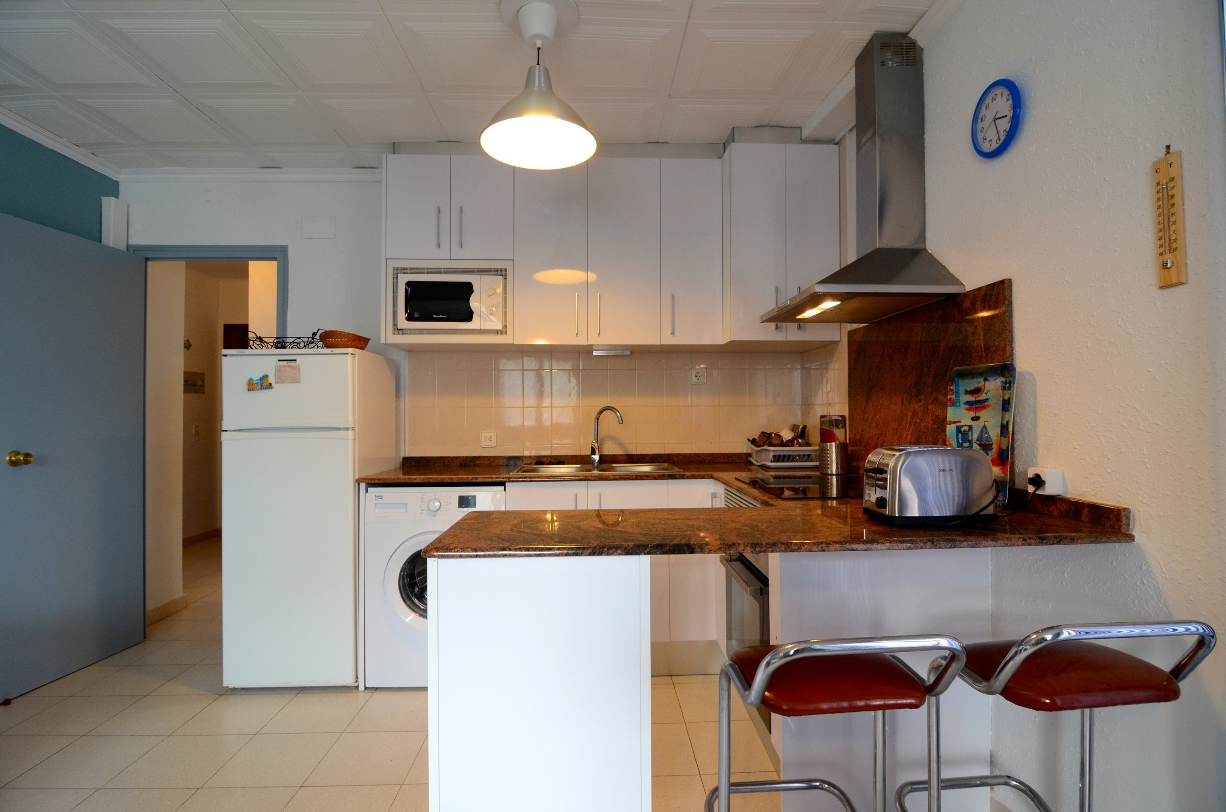 La cocina americana está totalmente equipada con electrodomésticos modernos como nevera, lavadora, horno, microondas, tostadora, máquina de café y menaje completo. Además, cuenta con aire acondicionado para garantizar tu confort durante los días más calurosos.