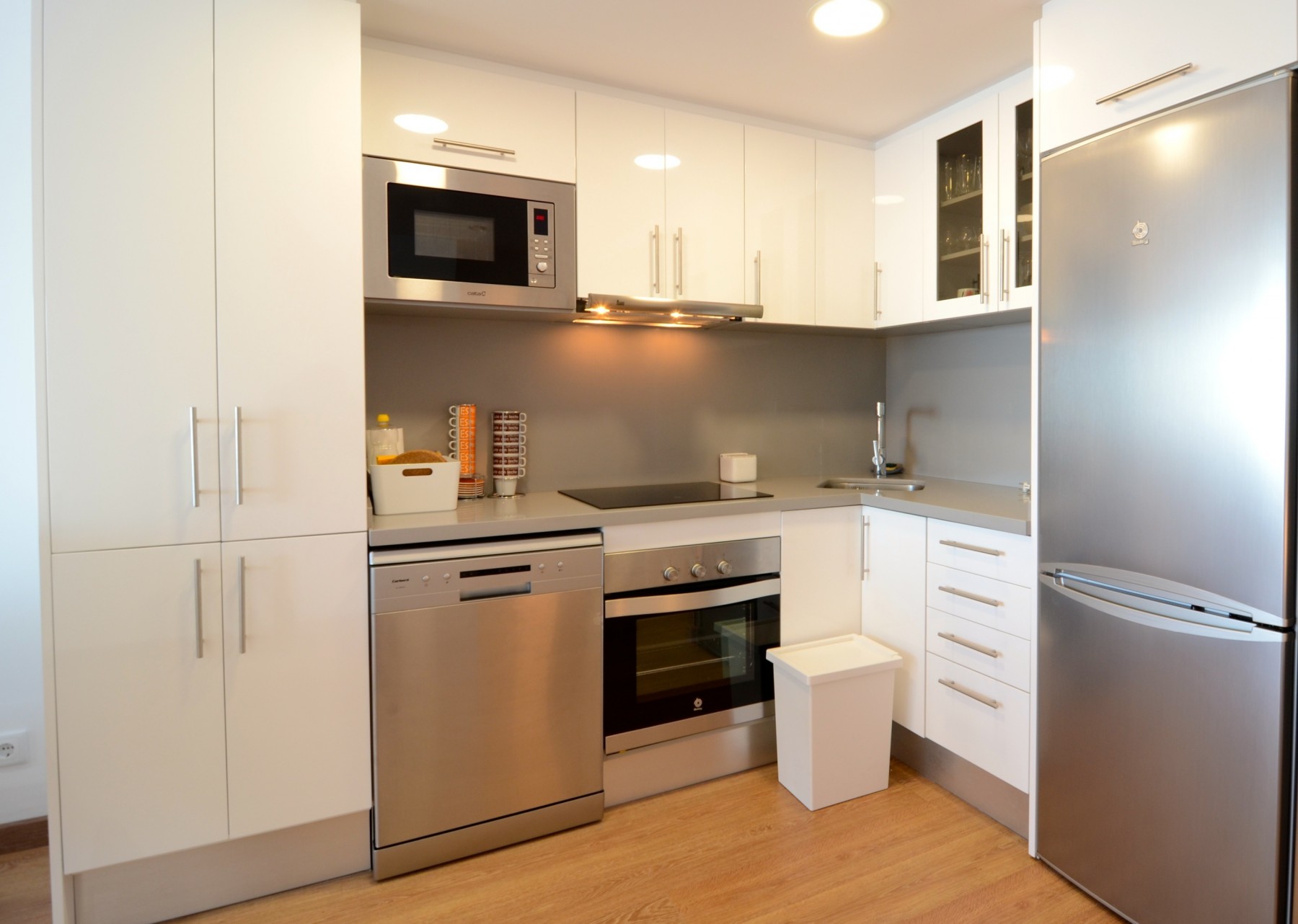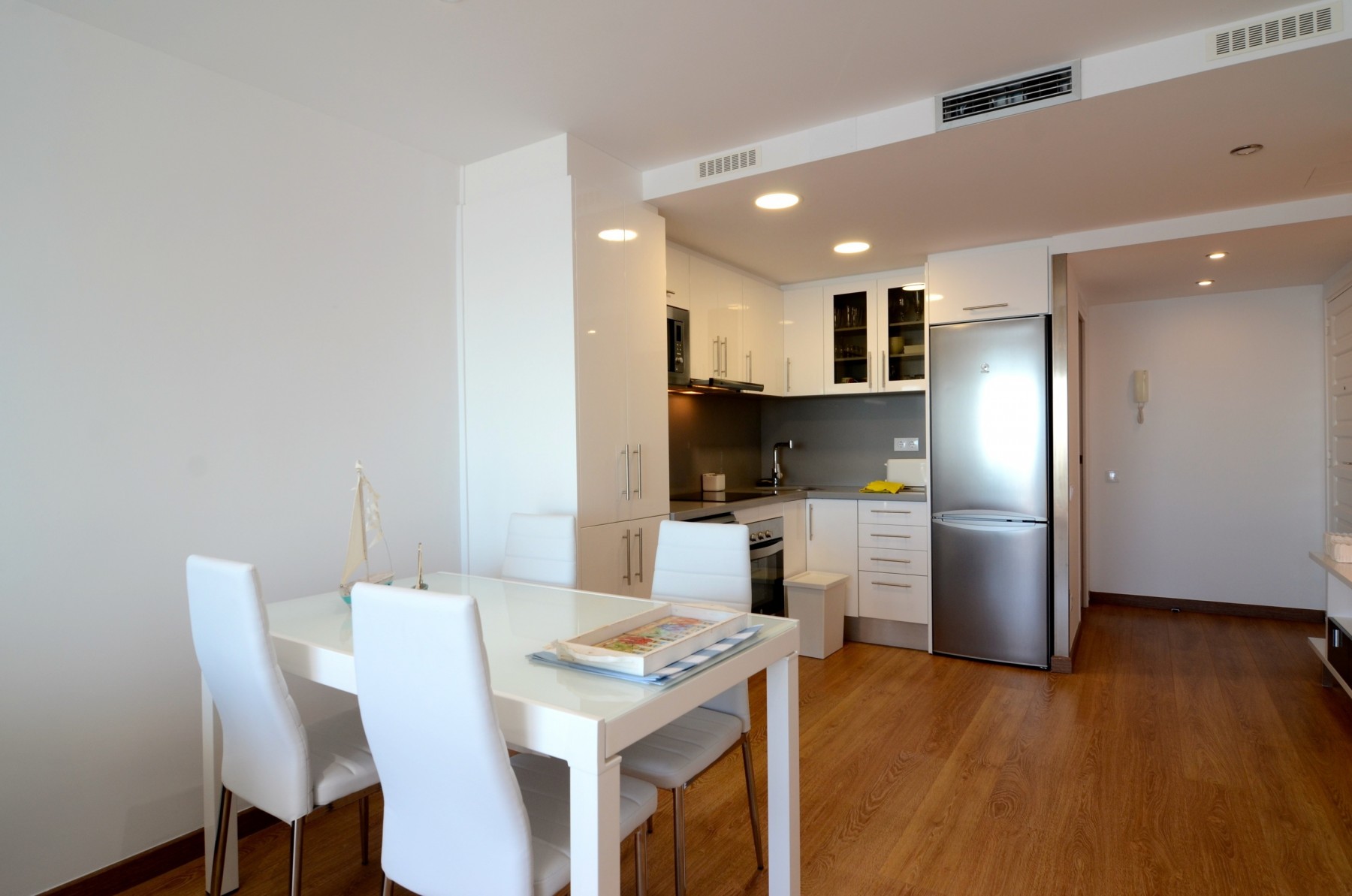 La cocina americana está completamente equipada con electrodomésticos de última generación, incluyendo nevera, lavadora, horno, microondas, cafetera, tostadora, hervidor, exprimidor y una amplia variedad de menaje. Dispone de placa de inducción para una cocina moderna y práctica.