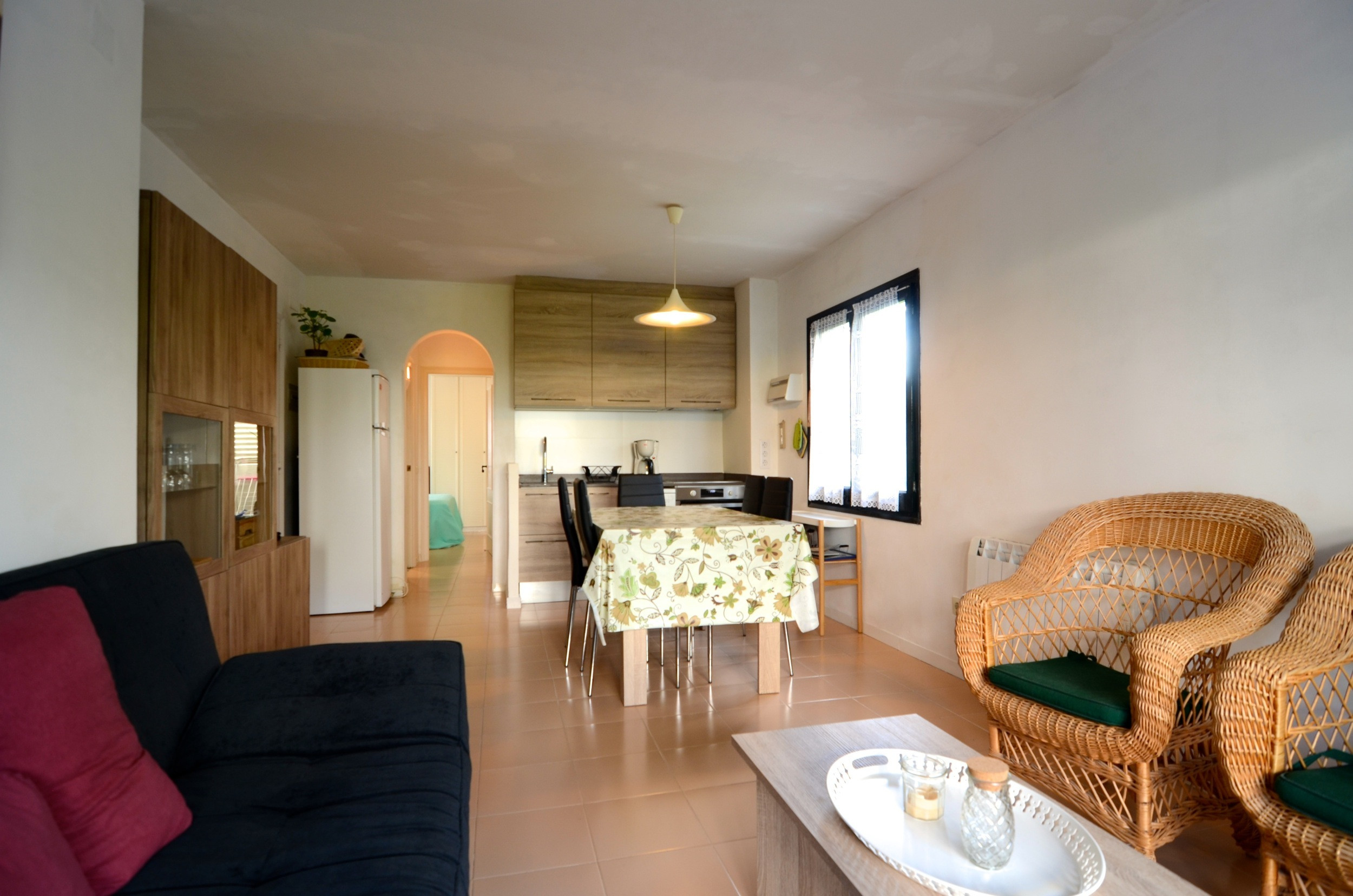 En el interior encontramos en un mismo espacio la cocina, comedor y salón con TV. Dos habitaciones dobles y una moderno baño con ducha.
