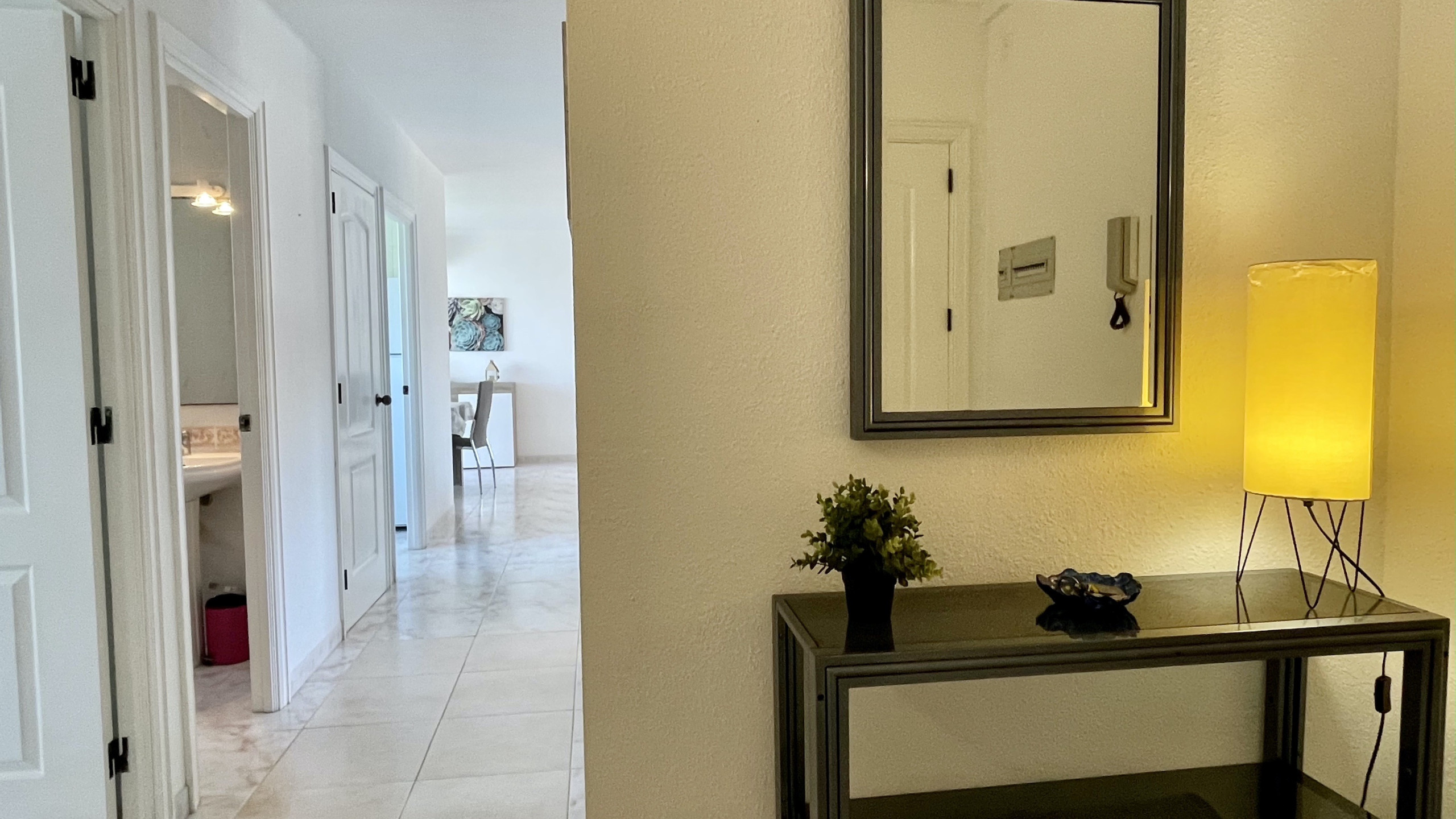 Hay un segundo baño con ducha, cocina independiente, gran salón comedor con chimenea y dos terrazas: la principal que tiene vistas a la piscina del Resort y otra con vista lateral a la playa.