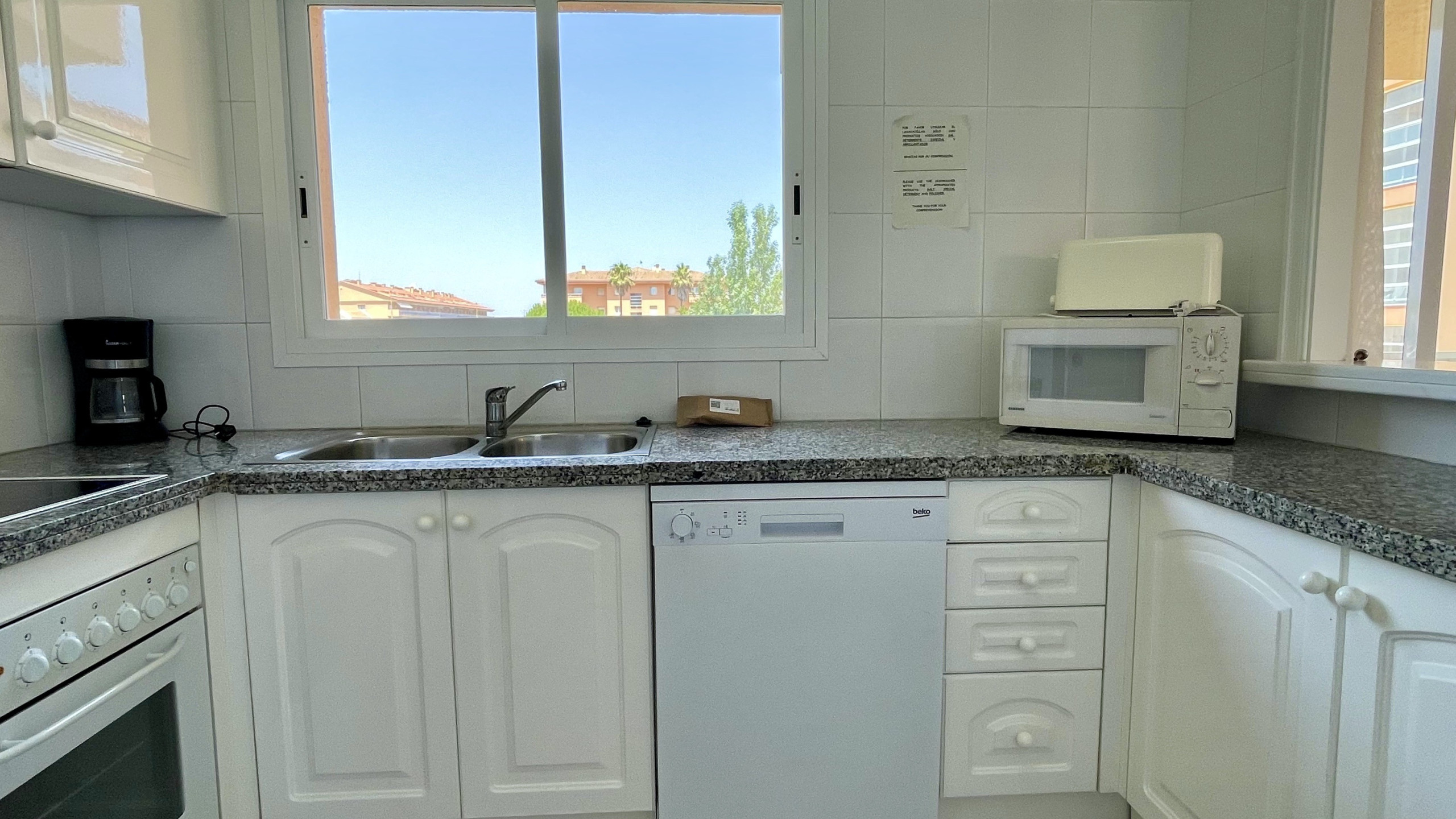La cocina americana, de vitrocerámica, está equipada con nevera, microondas, lavadora, vajilla/cubertería, utensilios/cocina, cafetera y tostadora.