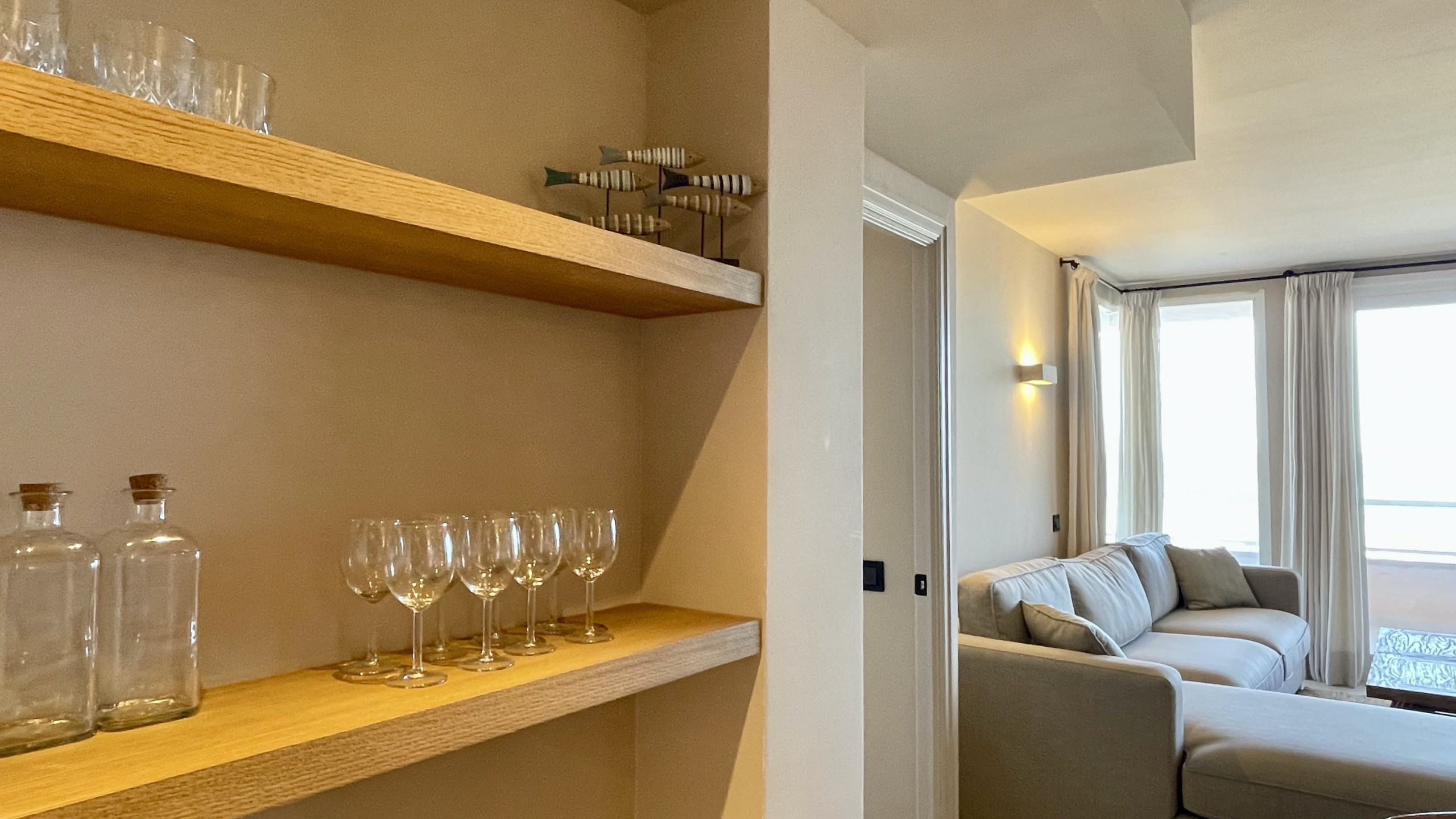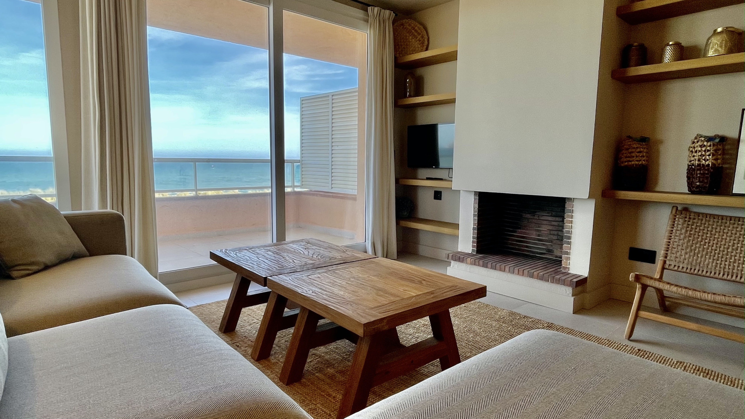 Completamente renovado con materiales de alta calidad, este apartamento ofrece un ambiente moderno y elegante. Su diseño de concepto abierto conecta la cocina con el amplio salón comedor, creando un espacio acogedor y funcional. La chimenea añade calidez en las noches frescas.