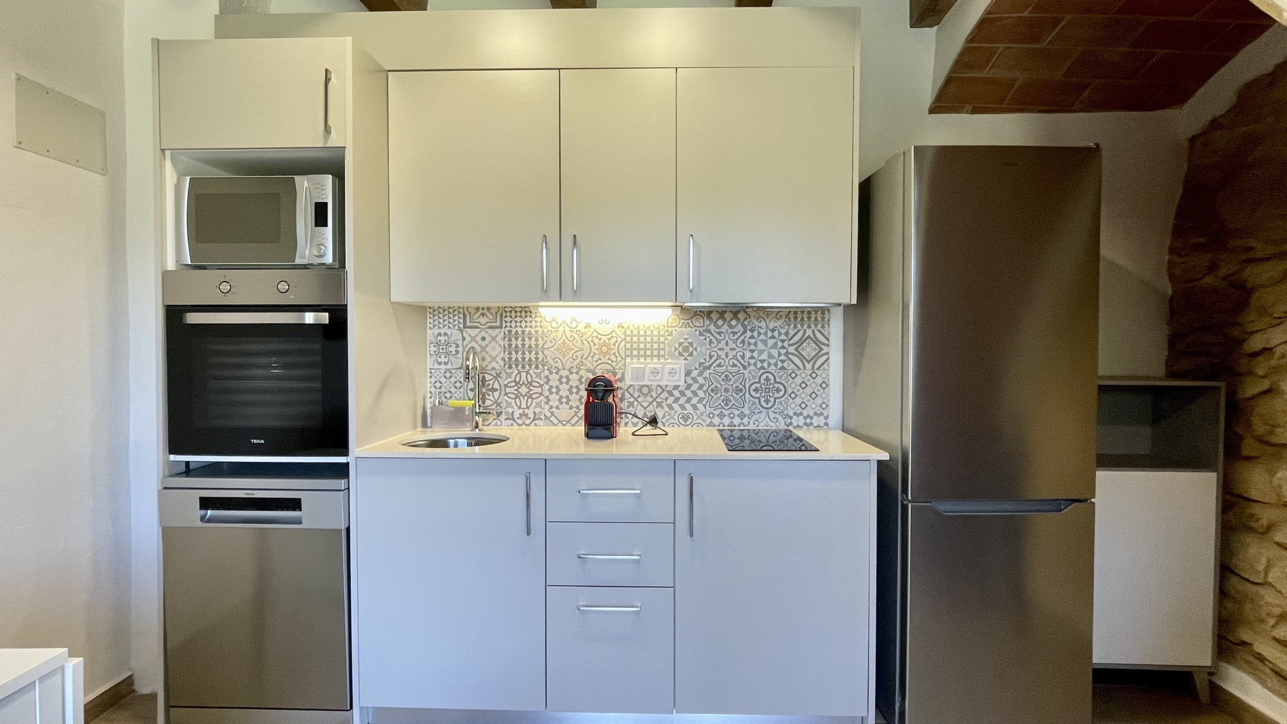 Con una cocina americana totalmente equipada, que incluye una moderna vitrocerámica, microondas, horno y lavavajillas, tendrás todo lo necesario para preparar deliciosas comidas caseras. Disfruta de tus platos en la terraza privada, rodeada de un exuberante jardín y mobiliario de exterior para disfrutar del clima mediterráneo.