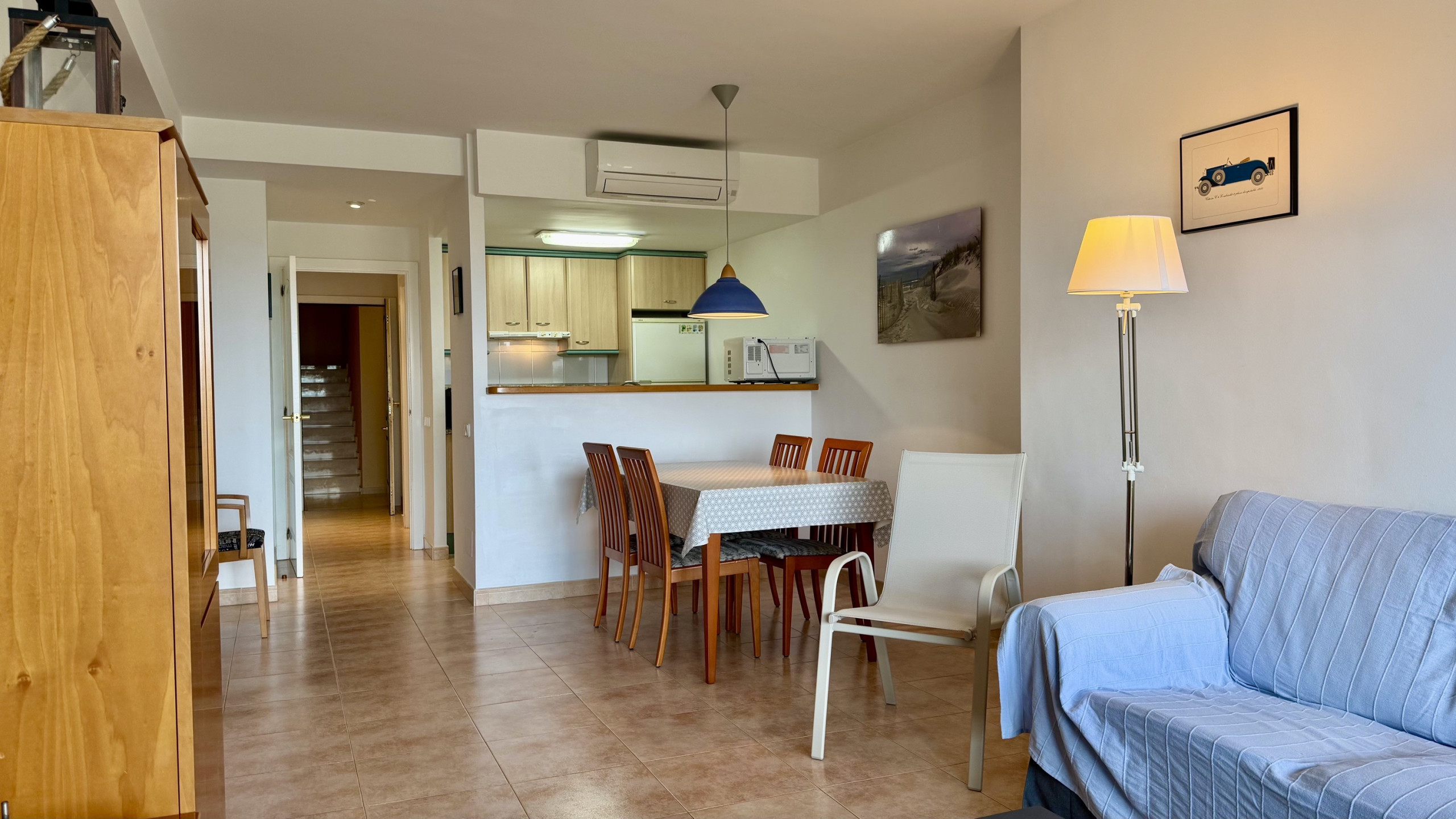 El apartamento destaca por su diseño elegante y funcional, amueblado con gusto y pensado para el confort familiar. Dispone de una cocina americana completamente equipada con electrodomésticos modernos como lavavajillas, horno, microondas, cafetera y todos los utensilios necesarios para preparar comidas deliciosas.