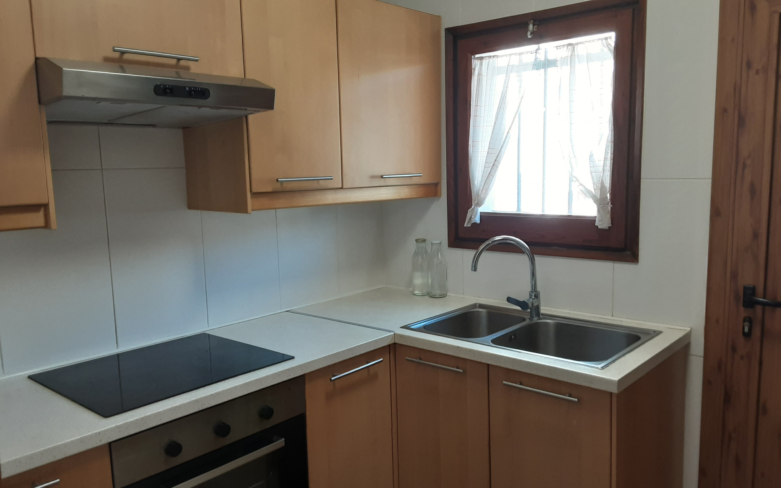La cocina es completamente equipada e independiente, con placa vitrocerámica y una amplia variedad de electrodomésticos como nevera, congelador, lavadora, horno, cafetera, tostadora y menaje completo. Ideal para preparar comidas y disfrutar en familia.