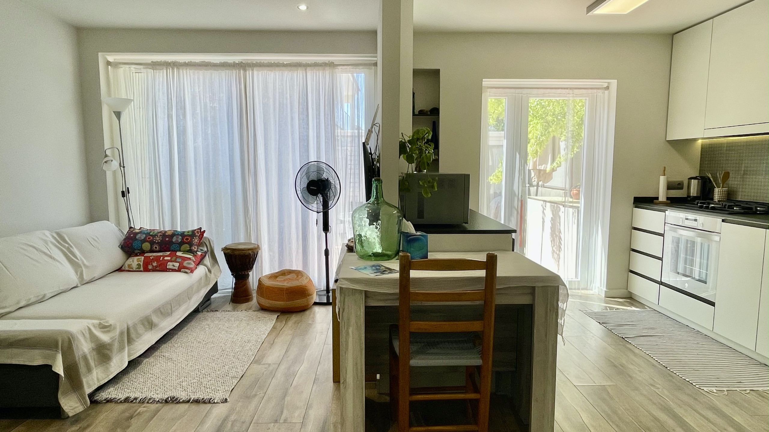 La cocina está completamente equipada con nevera, microondas, horno, congelador, vajilla, cubertería, utensilios de cocina, cafetera y tostadora. El patio ofrece un espacio ideal para disfrutar de comidas al aire libre o momentos de descanso al sol.
