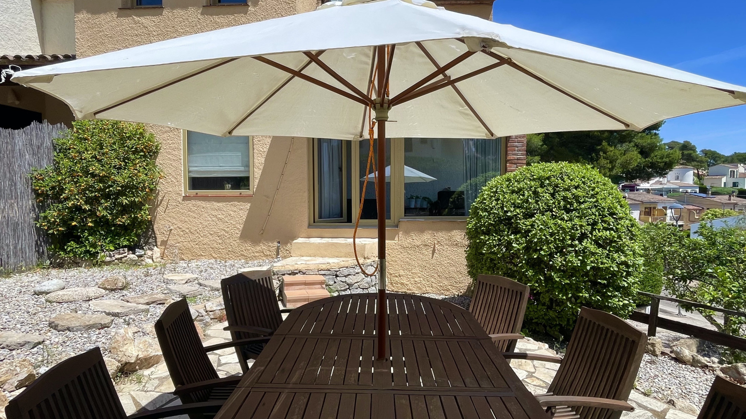 El exterior de la casa cuenta con una gran terraza ideal para disfrutar de comidas al aire libre, un hermoso jardín mediterráneo que invita a relajarse, mobiliario de jardín y una parcela vallada que ofrece privacidad y seguridad. También dispone de parking al aire libre en el mismo edificio. Para su comodidad, la casa está equipada con lavadora, plancha y un televisor.