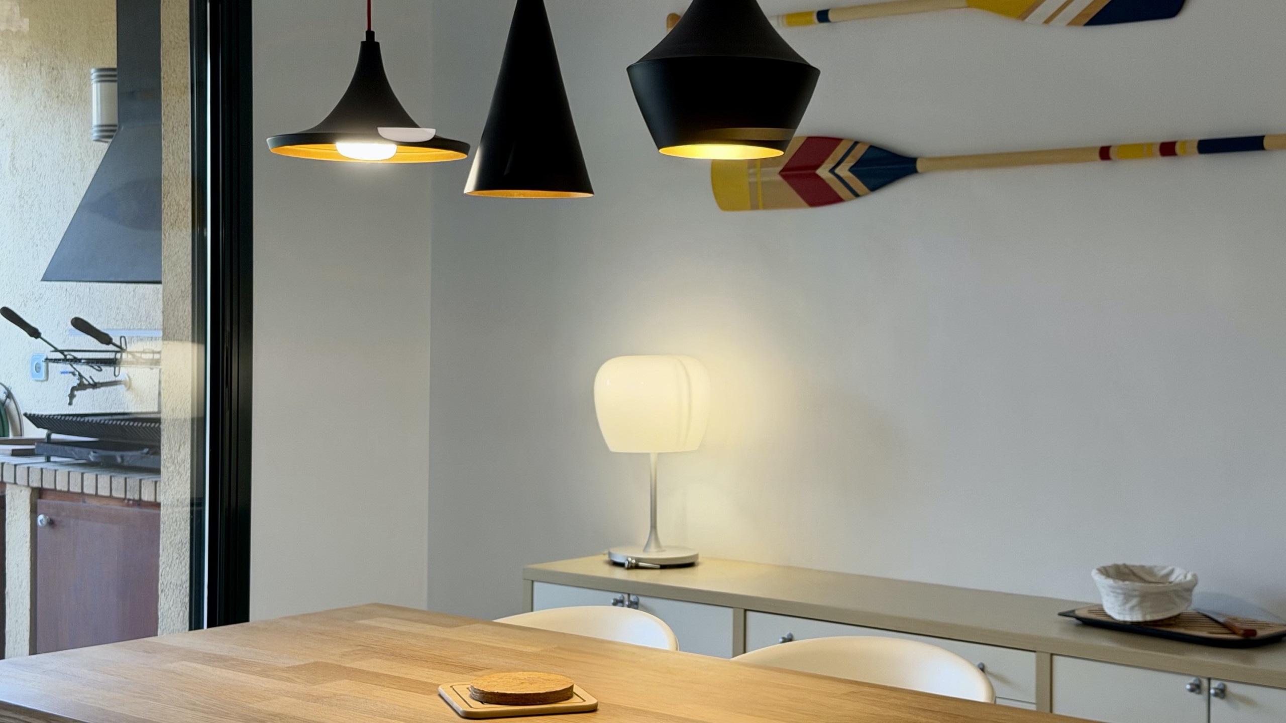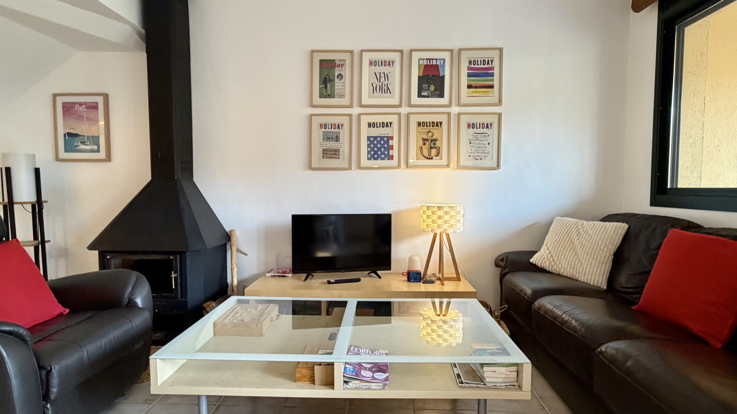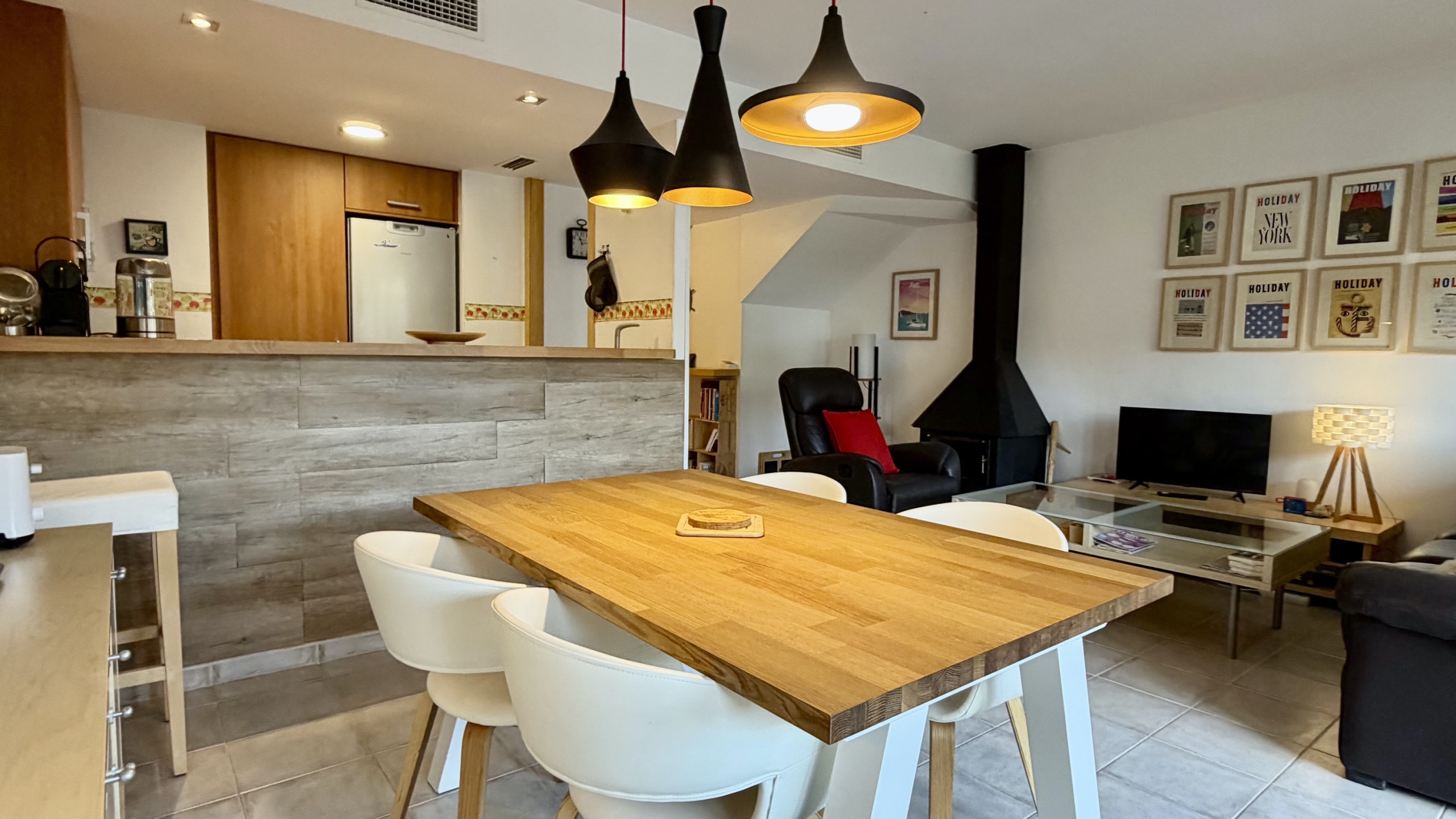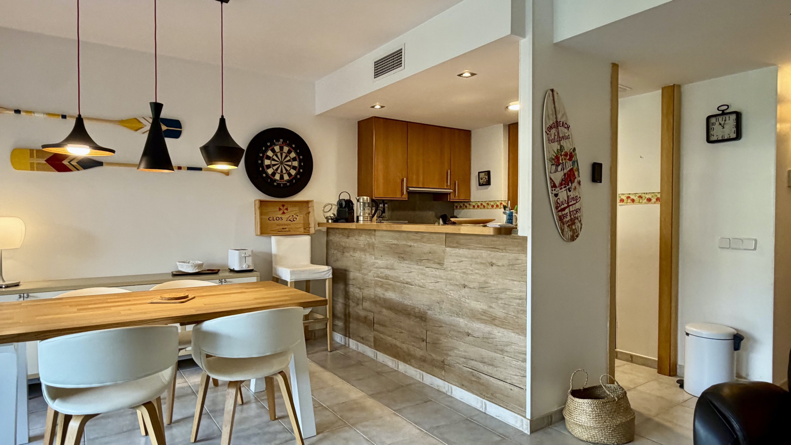 El interior destaca por su funcionalidad y confort. La cocina americana está completamente equipada con electrodomésticos de última generación, incluyendo nevera, horno, microondas, lavavajillas y máquina de café. Además, cuenta con chimenea para noches más frescas, plancha y dos televisores para el entretenimiento familiar. NO dispone de lavadora.