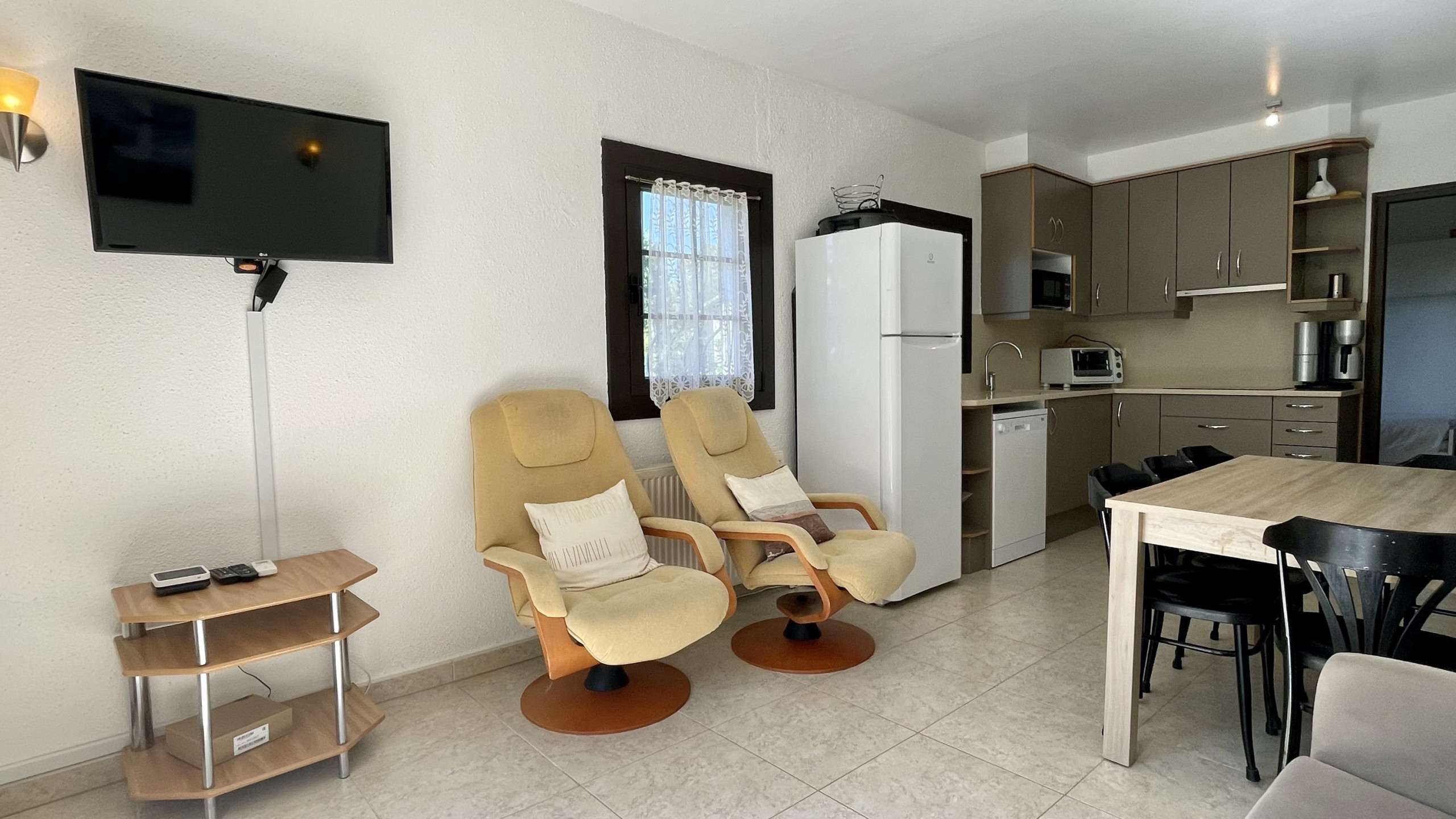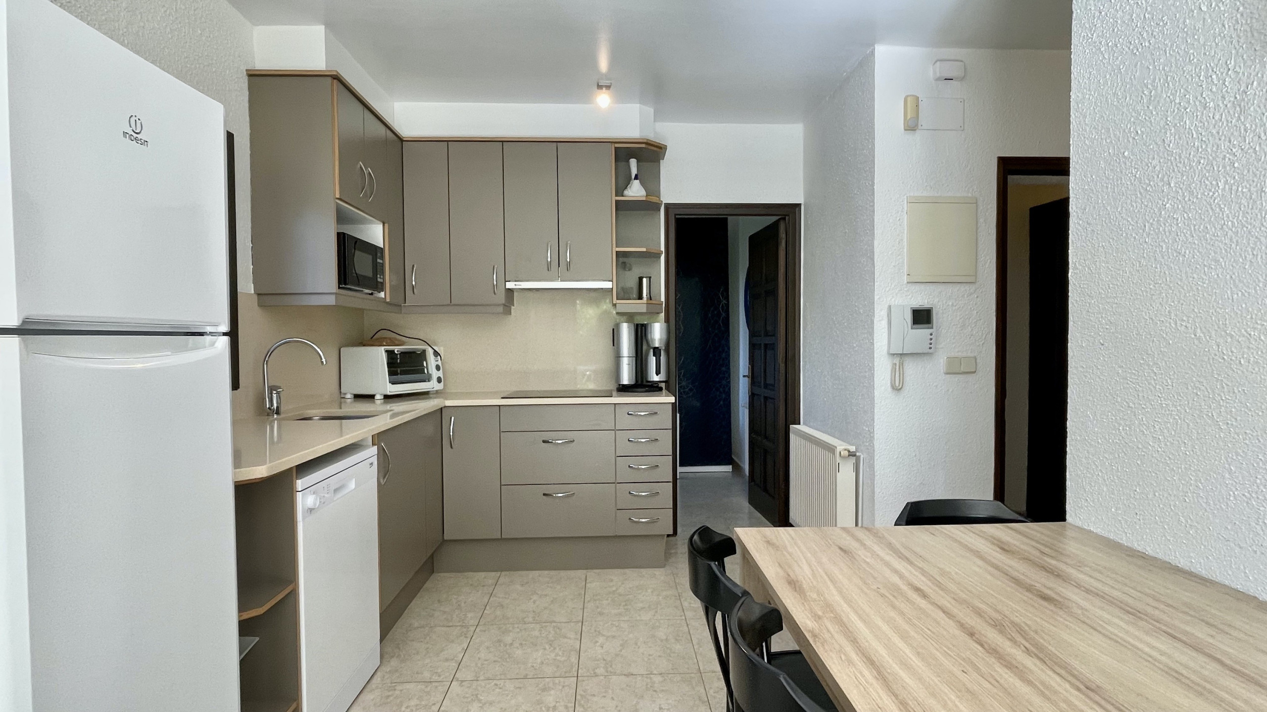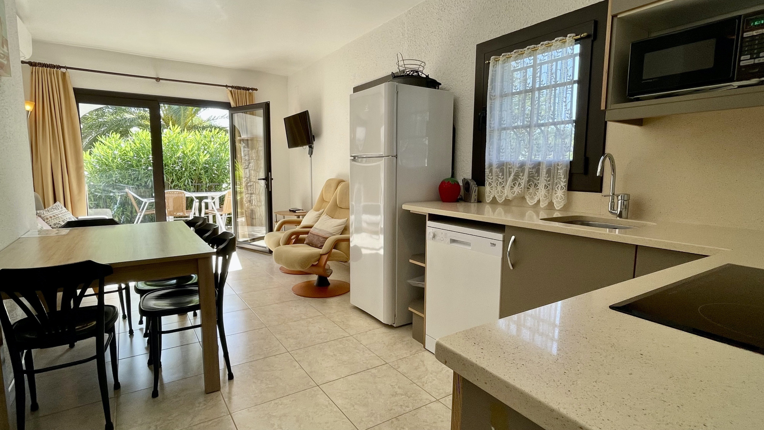 Les llençols estan incloses a l'allotjament, i si es requereixen tovalloles de bany, estan disponibles per un cost addicional de 5 euros per persona. La cuina americana, equipada amb electrodomèstics moderns com ara nevera, microones, forn, congelador, rentadora, rentavaixelles, així com estris i vaixella complets, ofereix totes les comoditats necessàries. A més, compta amb una cafetera, torradora i espremedor per satisfer les necessitats culinàries dels hostes.