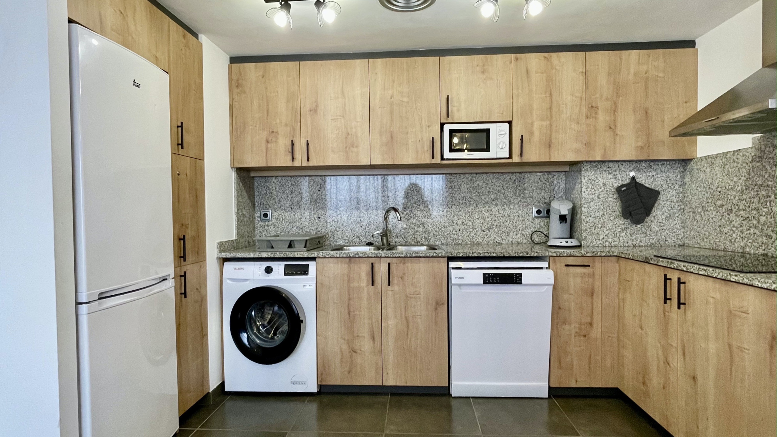 Un gran avantatge és l'aparcament privat cobert ubicat al mateix edifici, la qual cosa facilita enormement l'arribada i sortida amb equipatge o per realitzar excursions. La zona compta amb aire condicionat per mantenir un ambient fresc durant els dies més calorosos, i una cuina americana completament equipada amb electrodomèstics moderns com rentaplats, forn, microones i màquina de cafè.