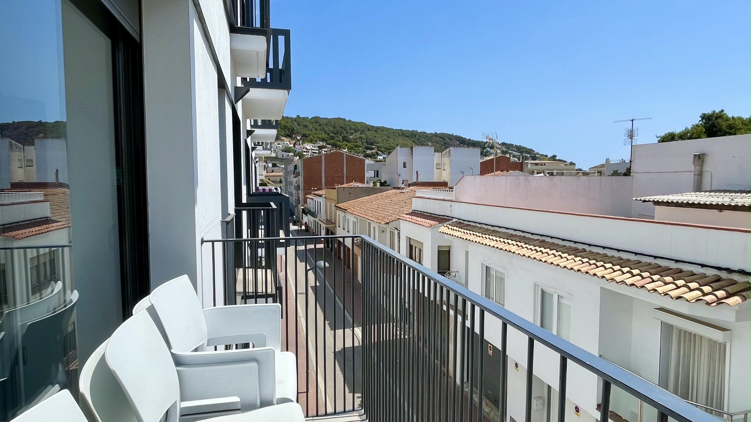 L'apartament té una gran terrassa amb una vista immillorable de tot el complex Rocamaura, amb la piscina als teus peus i les Illes Medes de fons.