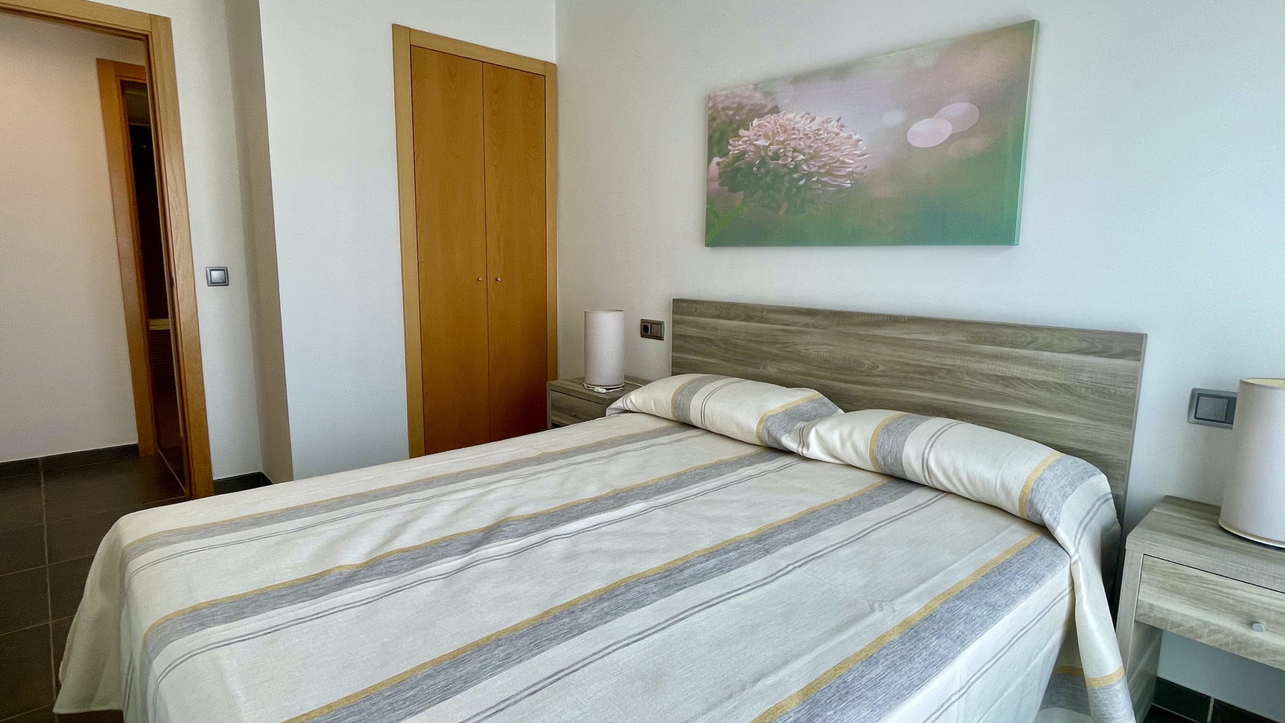 L'apartament disposa de 3 dormitoris ben distribuïts: un dormitori principal amb llit de matrimoni, un altre amb sofà-llit i un tercer amb 3 llits individuals, garantint un descans confortable per a tots els hostes. L'habitatge compta amb un únic lavabo complet amb banyera, ideal per a famílies amb nens.