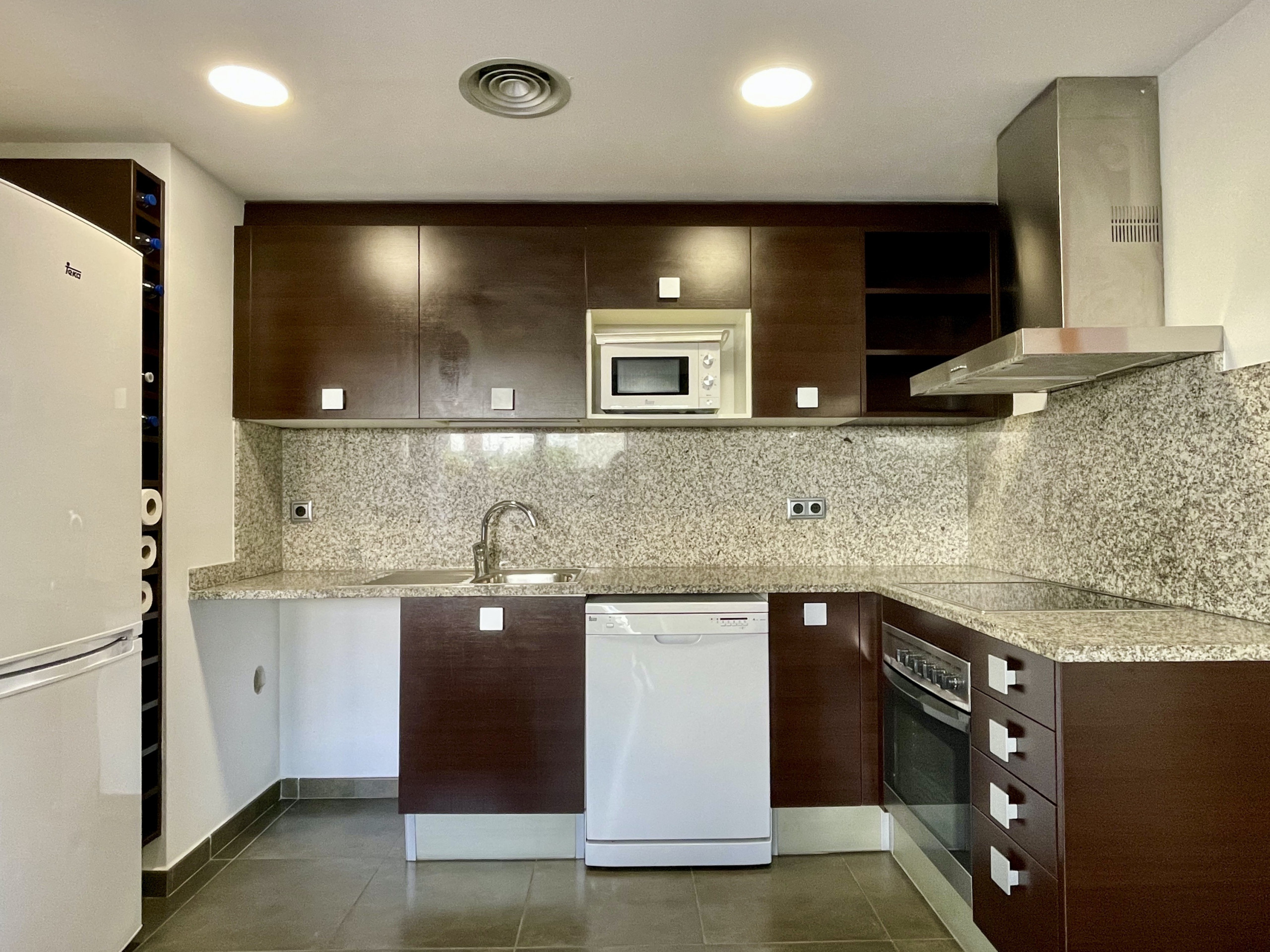 A l'interior de l'apartament, trobaràs un ambient acollidor amb calefacció bomba de calor i aire condicionat en tot l'allotjament. La cuina americana, equipada amb vitroceràmica, nevera, microones, forn, congelador, rentavaixelles, cafetera, torradora, bullidor d'aigua i espremedora, té tot el que necessites per a preparar els teus plats preferits.
