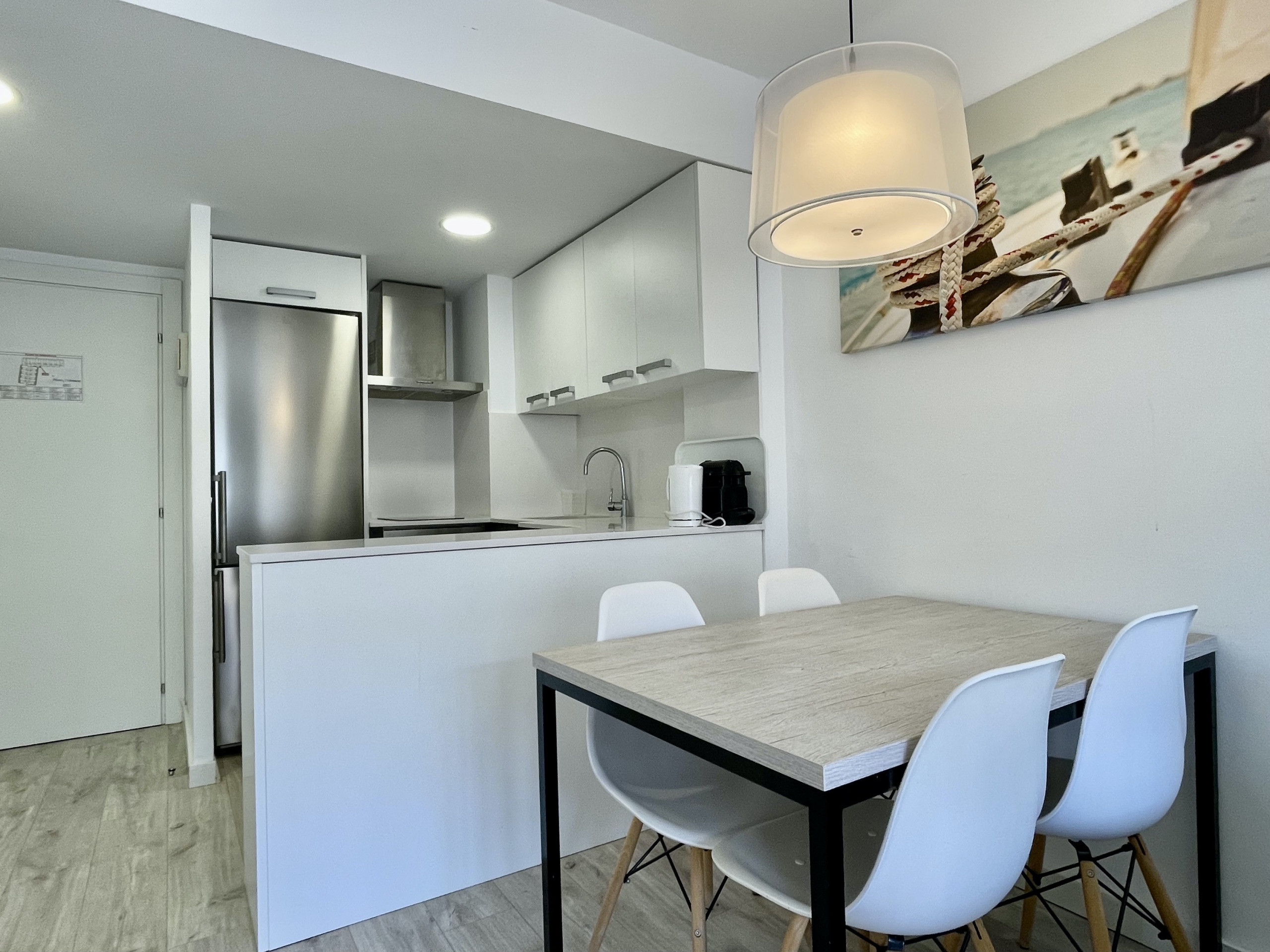La cuina americana, equipada amb sistema de cocció de vitroceràmica, està completament equipada amb els electrodomèstics essencials, com ara nevera, microones, congelador, rentadora, rentavaixelles, a més de vaixella, coberts, estris de cuina, cafetera i torradora. Les llençols estan incloses en el preu, i es poden afegir tovalloles per 5€/persona.