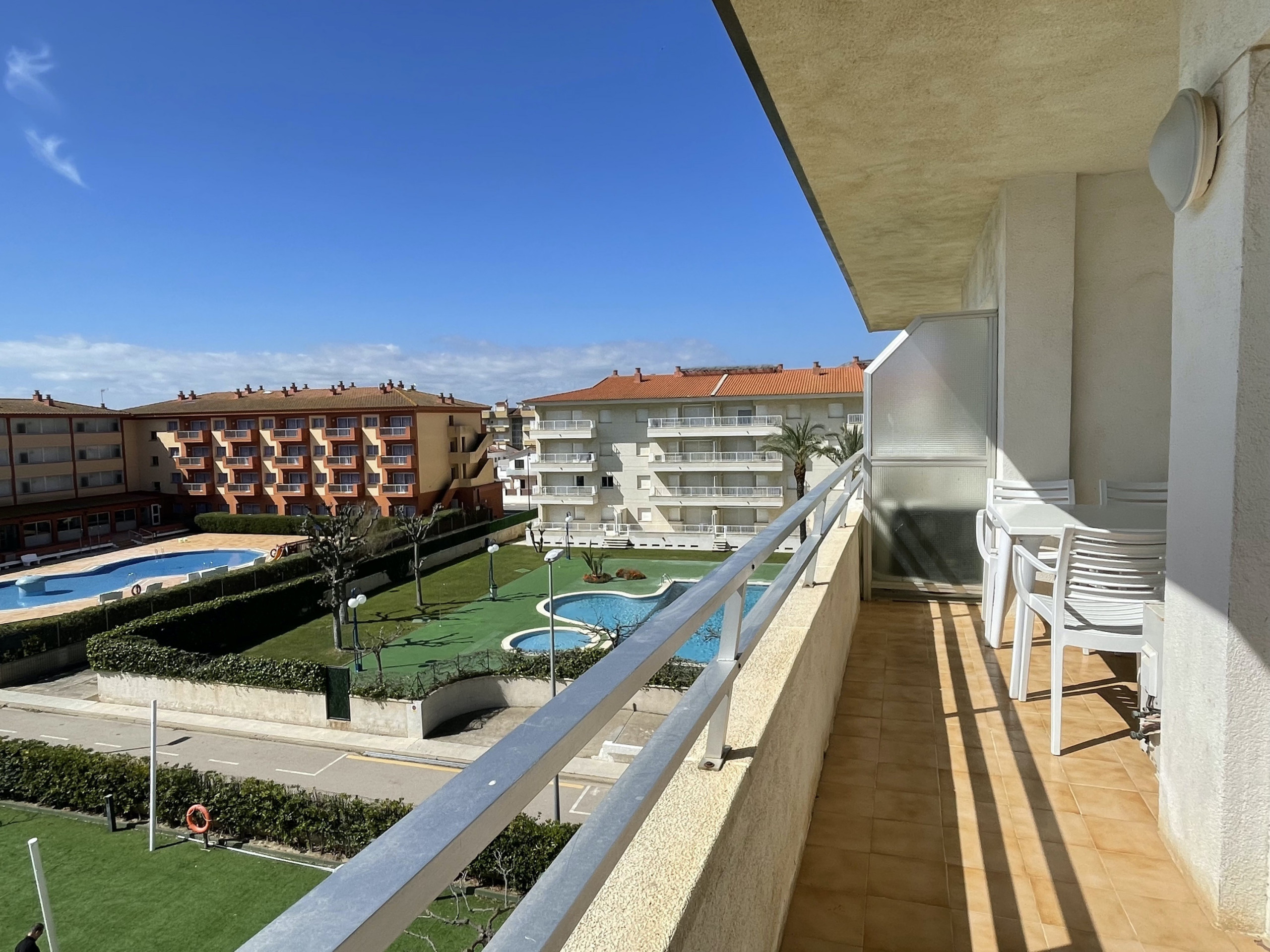 L'apartament té una gran terrassa amb una vista immillorable de tot el complex Rocamaura, amb la piscina als teus peus i les Illes Medes de fons.