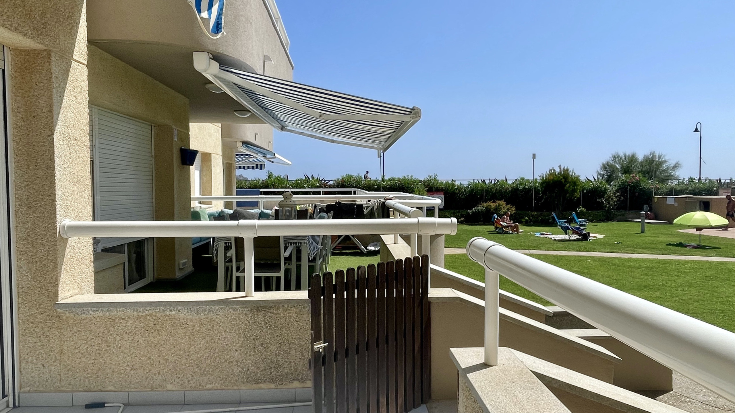 Ubicat a la planta baixa de l'edifici Manureva, aquest apartament ofereix accés directe des de la seva terrassa a la piscina i al jardí comunitari. Travessant el passeig peatonal, arribaràs directament a la platja, just davant de les Illes Medes, oferint unes vistes espectaculars.