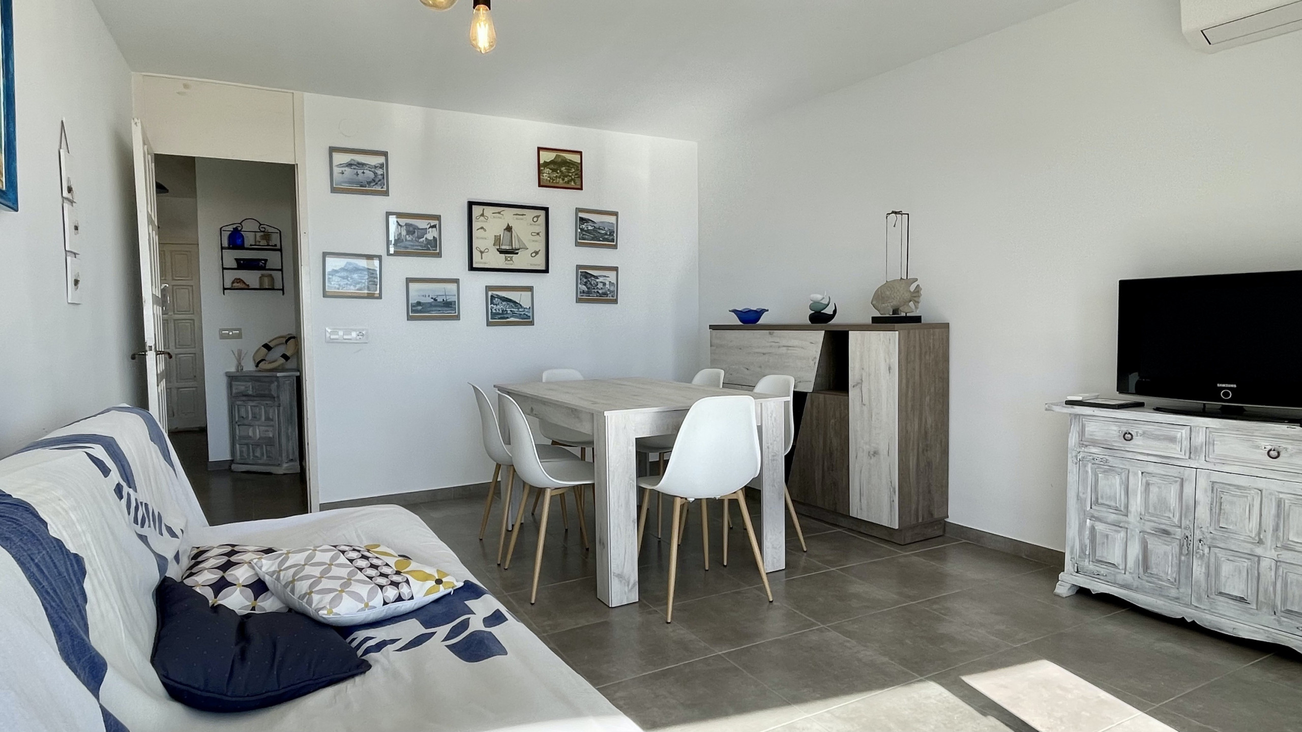 Pujant al nivell superior, us sorprendran dos còmodes llits individuals i una petita sala d'estar equipada amb un pràctic sofà llit i TV, perfecte per relaxar-vos després d'un divertit dia a la platja.