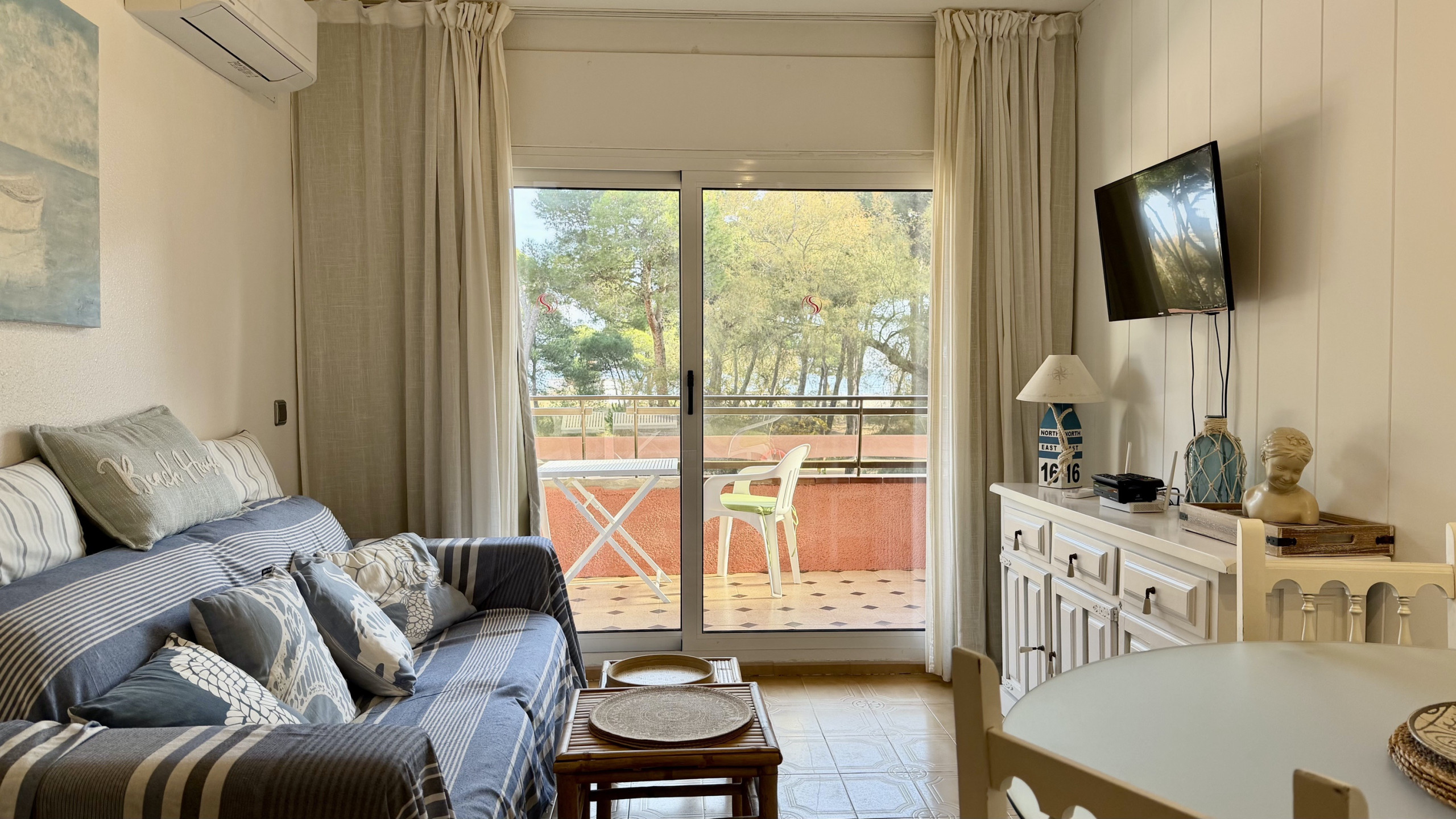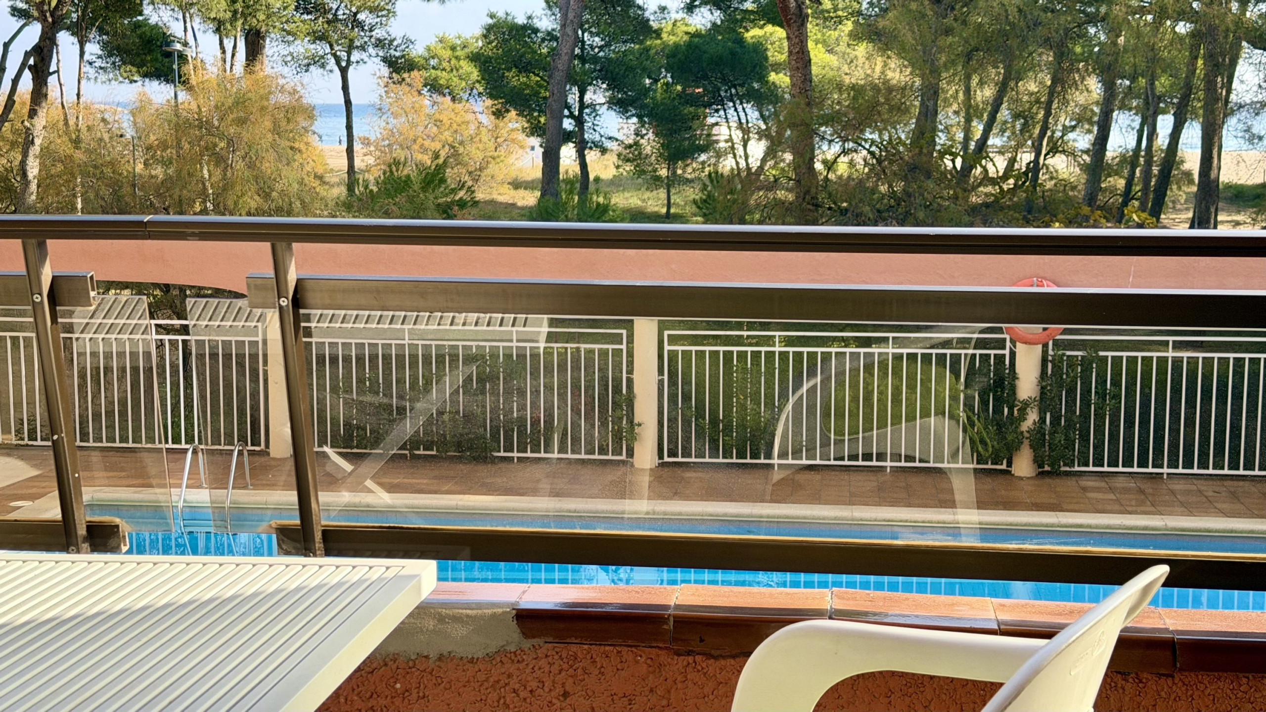 L'apartament té una gran terrassa amb una vista immillorable de tot el complex Rocamaura, amb la piscina als teus peus i les Illes Medes de fons.