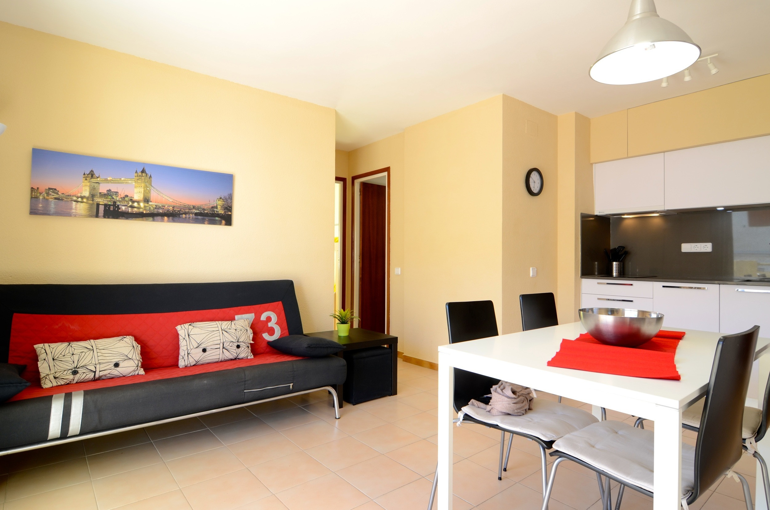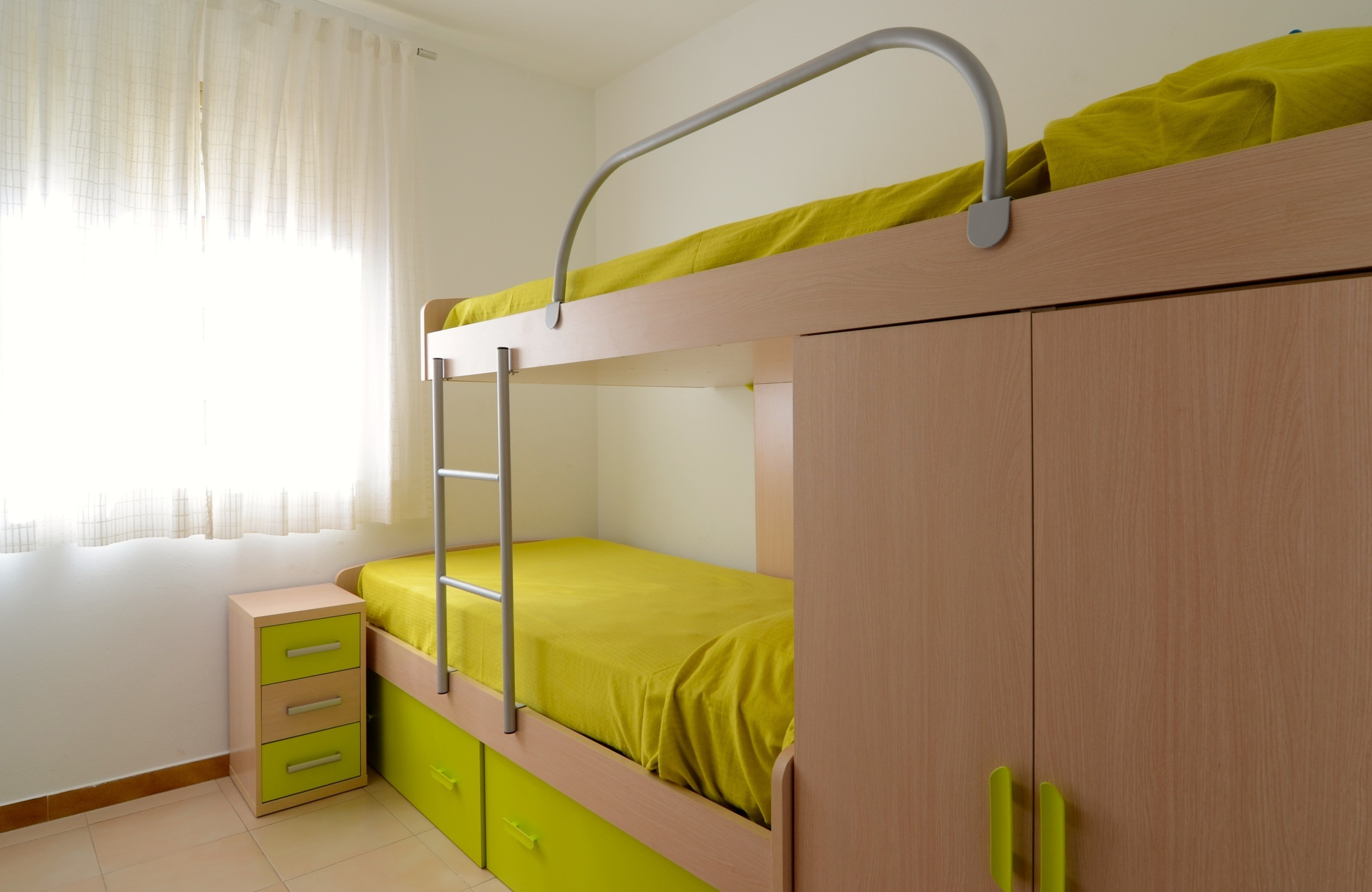 L'apartament compta amb dos dormitoris: un amb llit de matrimoni i un altre amb llitera, ideal per maximitzar l'espai. La cuina americana està totalment equipada amb electrodomèstics moderns com nevera, congelador, microones, cafetera, torradora i parament complet. Disposa d'un lavabo amb dutxa.