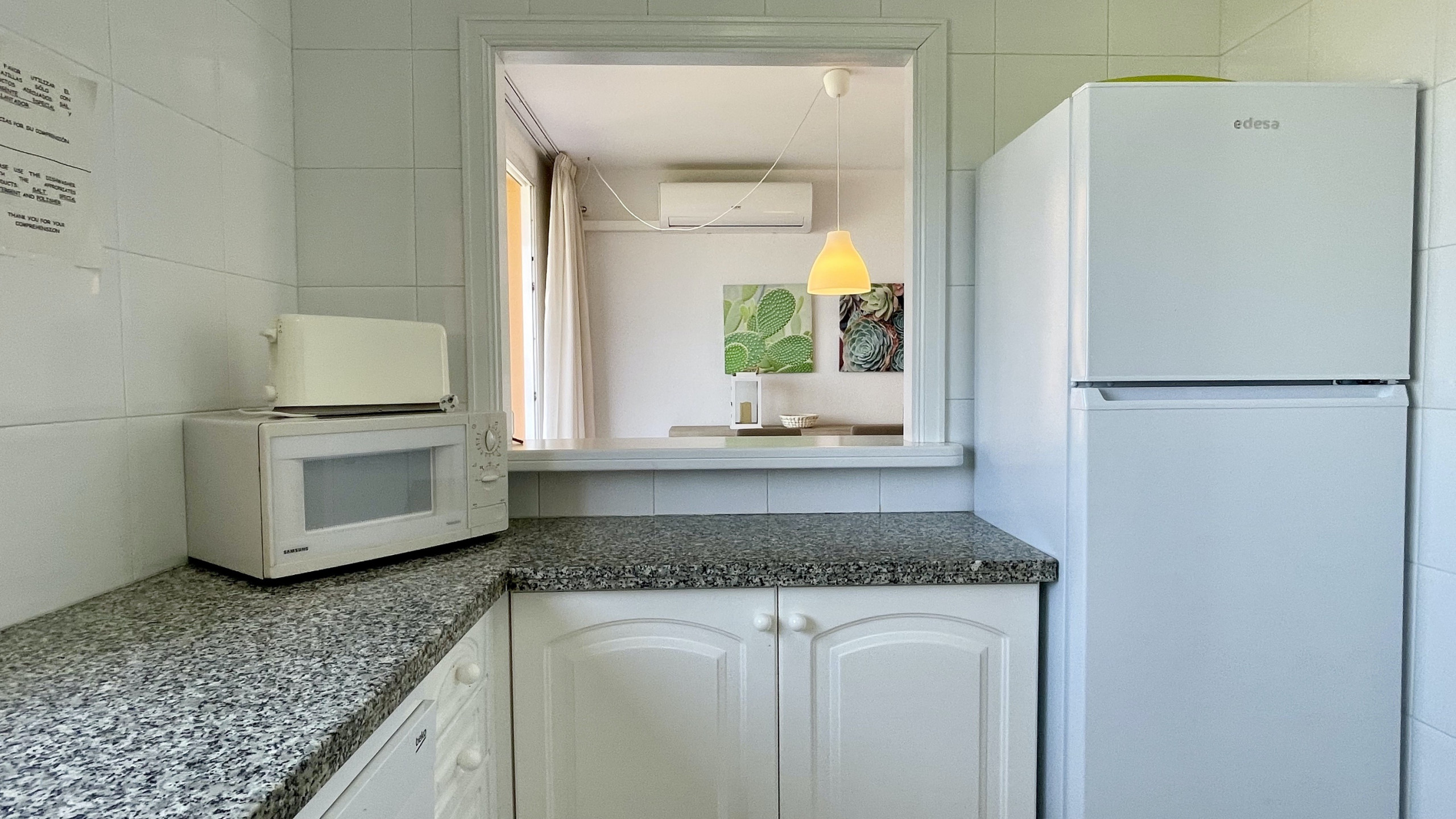 La cuina americana, de vitroceràmica, està equipada amb nevera, microones, rentadora, vaixella/coberteria, estris/cuina, cafetera i torradora.