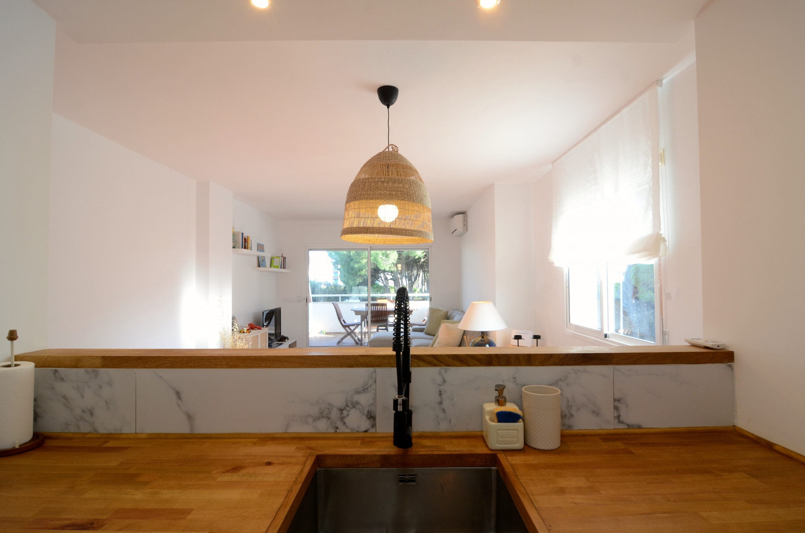 Allotjament de 70 m² moblat amb gust i mobles nous, amb vistes al jadí i a la piscina.