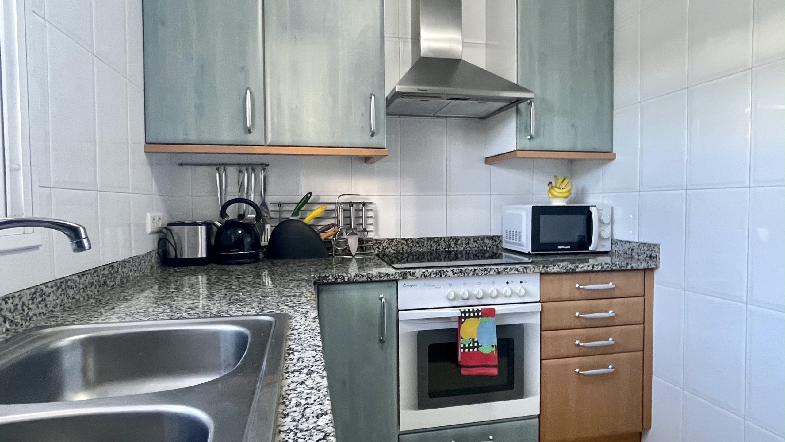 La cuina americana està totalment equipada amb electrodomèstics moderns com ara nevera, congelador, rentadora, cafetera, microones i estris de cuina complets. El saló està climatitzat per mantenir un ambient fresc durant els dies més calorosos.