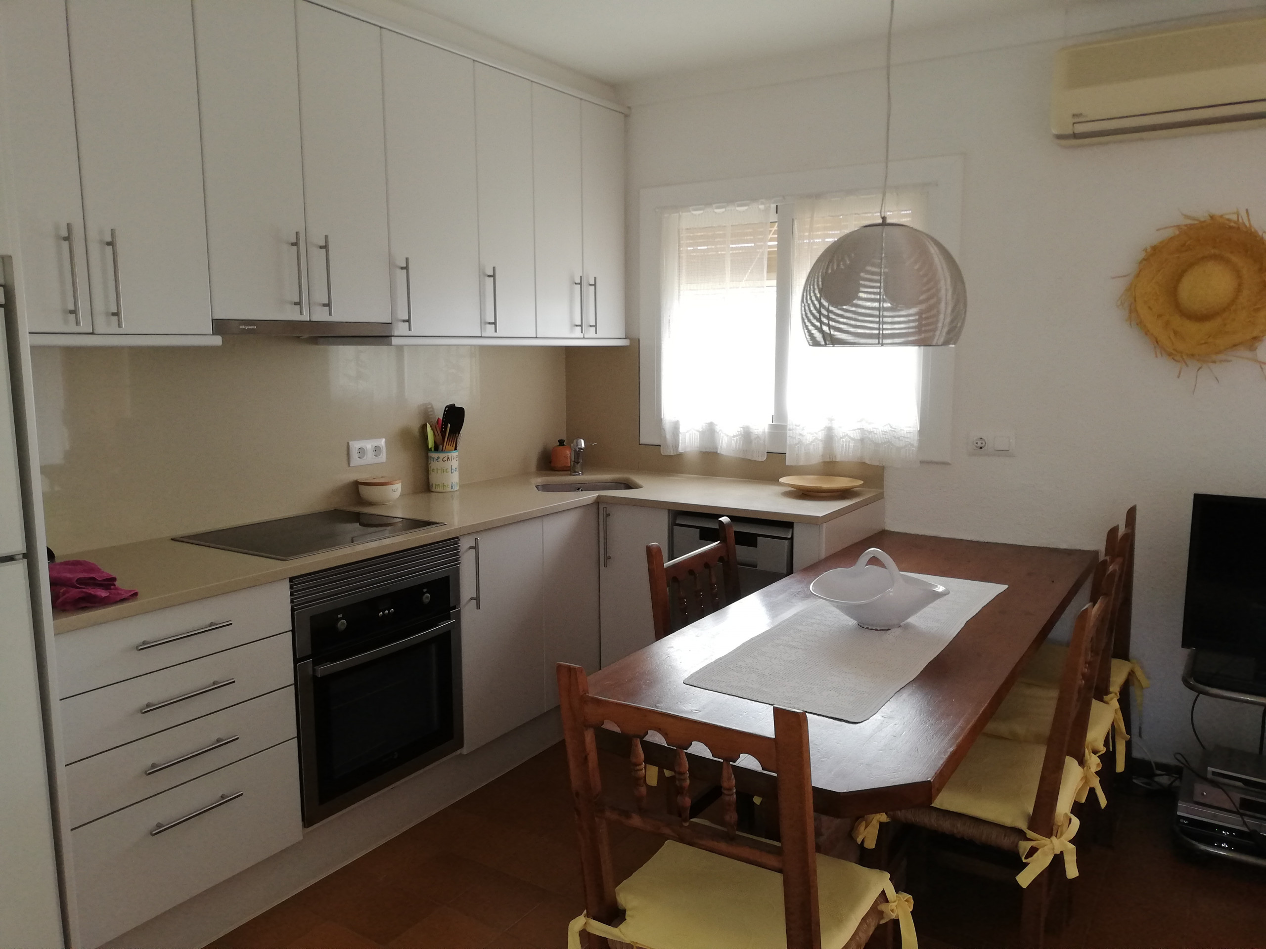 A l'interior, la casa està ben equipada amb cuina americana de gas butà i electrodomèstics essencials com ara nevera, microones, forn, congelador, rentadora, rentaplats, vaixella/cuberts, estris de cuina, cafetera, torradora i espremedor.