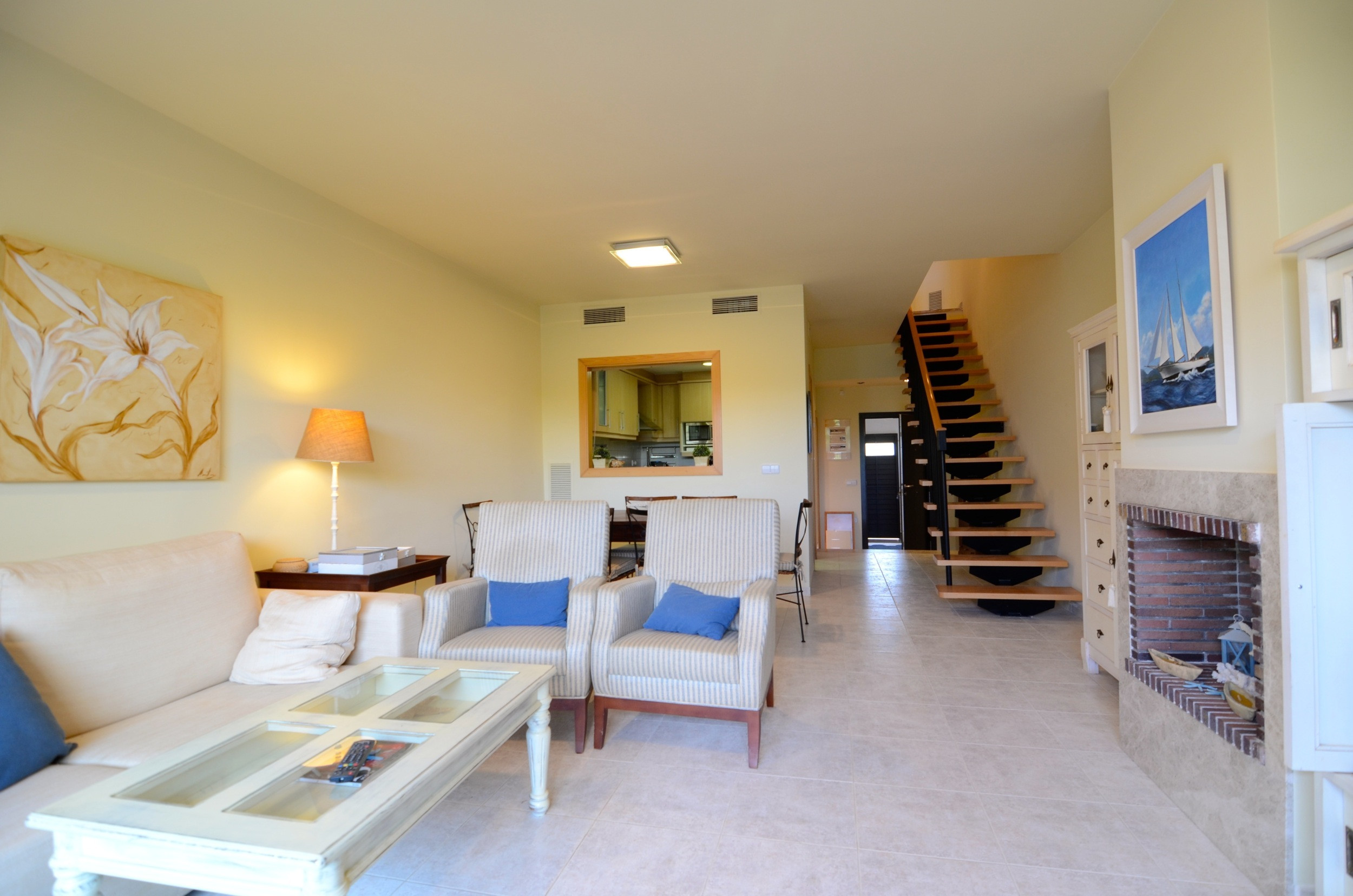 Im Erdgeschoss befindet sich eine offene Küche, die mit dem Essbereich verbunden ist, ein einladendes Wohnzimmer mit Kamin und TV sowie ein Badezimmer mit Dusche für zusätzlichen Komfort. Im ersten Stock bieten zwei geräumige Schlafzimmer mit Doppelbetten erholsamen Schlaf, ergänzt durch ein vollständiges Badezimmer mit Badewanne. Von der Terrasse auf dieser Etage aus können Sie den Blick auf den Garten genießen und eine entspannte Umgebung schaffen.