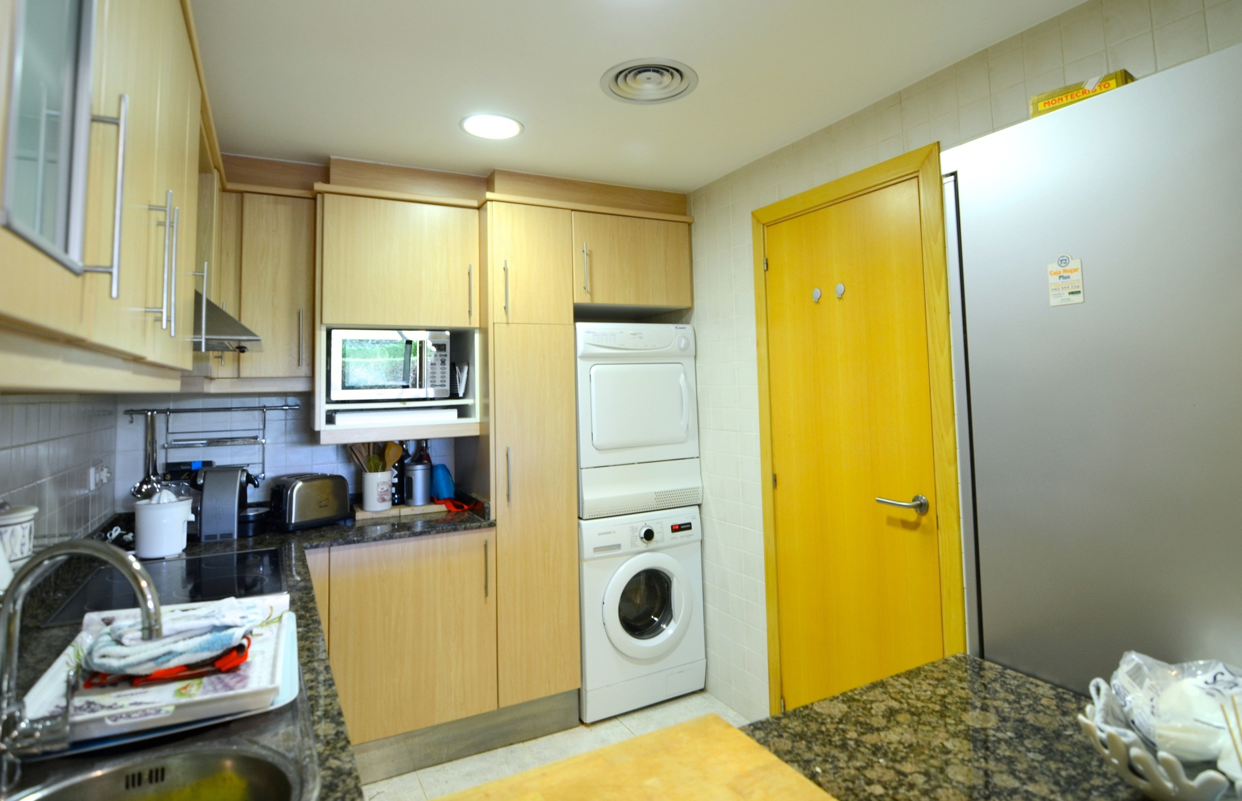 Die unabhängige Küche mit vitro-keramischem Kochsystem verfügt über moderne Annehmlichkeiten wie einen Kühlschrank, Mikrowelle, Backofen, Gefrierschrank, Waschmaschine, Trockner, Geschirrspüler, Geschirr/Besteck, Küchenutensilien und eine Kaffeemaschine.