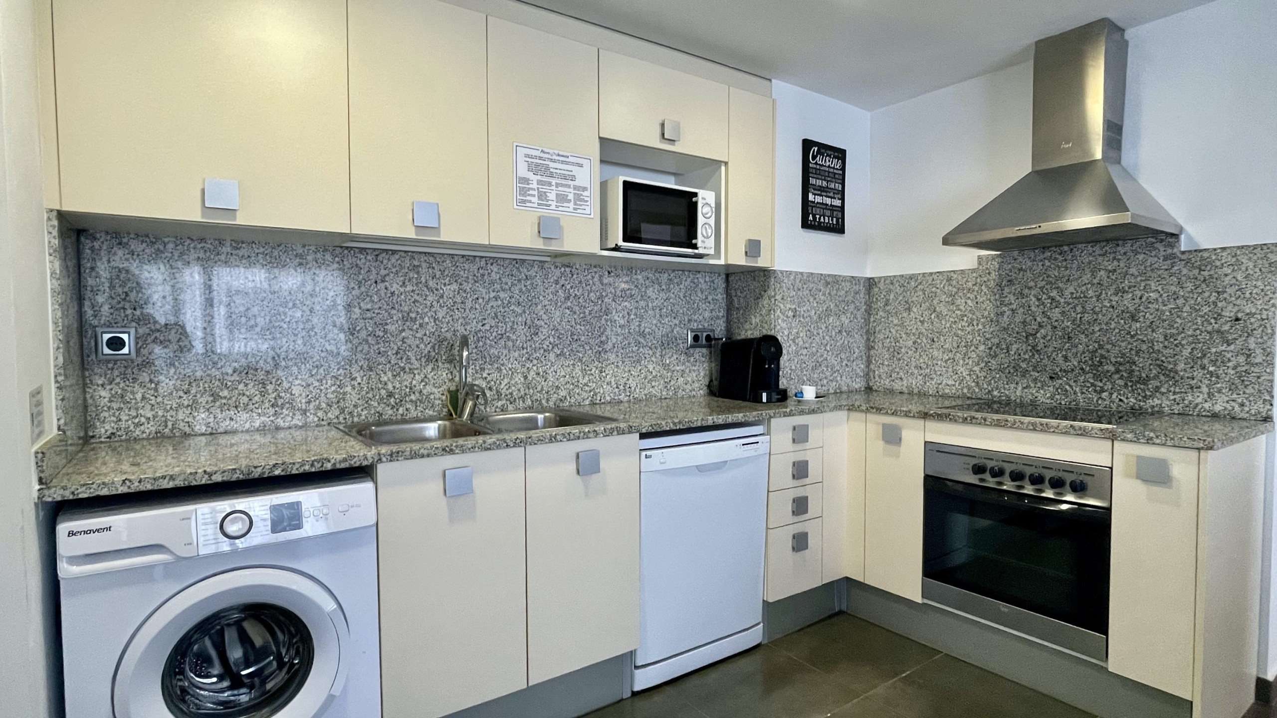 Die amerikanische Küche, ausgestattet mit einem Glaskeramikkochfeld, bietet alle notwendigen Annehmlichkeiten, einschließlich Kühlschrank, Mikrowelle, Backofen, Gefrierschrank, Geschirrspüler, Geschirr, Besteck, Küchenutensilien, Kaffeemaschine und Toaster. Es ist der perfekte Ort, um einen entspannten Urlaub in einem modernen und praktischen Umfeld zu genießen.
