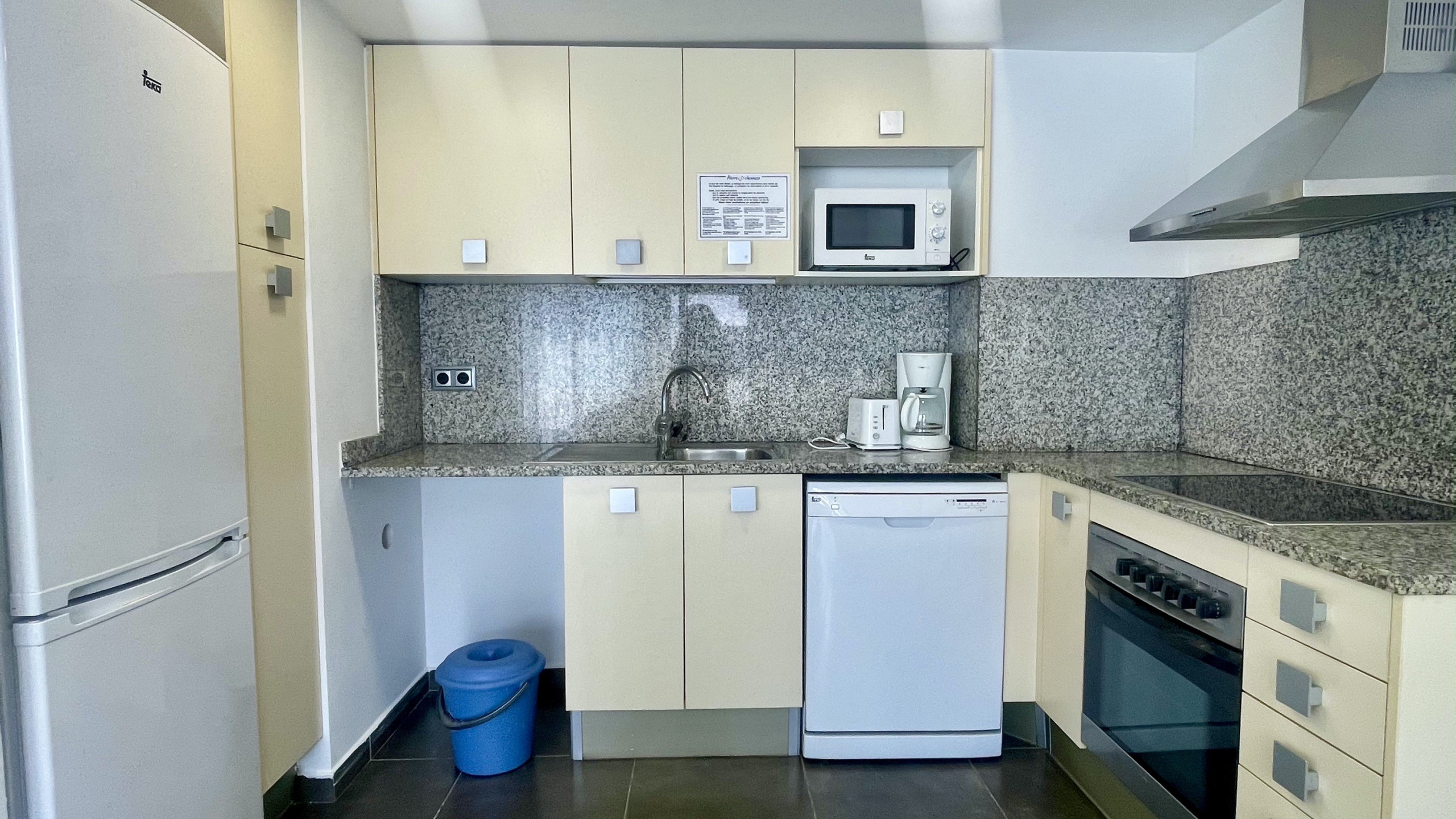 Die Offene Küche mit Ceranfeld ist ausgestattet in einen Kühlschrank, eine Mikrowelle, ein Backofen, Gefrierschrank, eine Spülmaschine, Geschirr/Besteck, Kochutensilien, eine Kaffeemaschine und einen Toaster.
