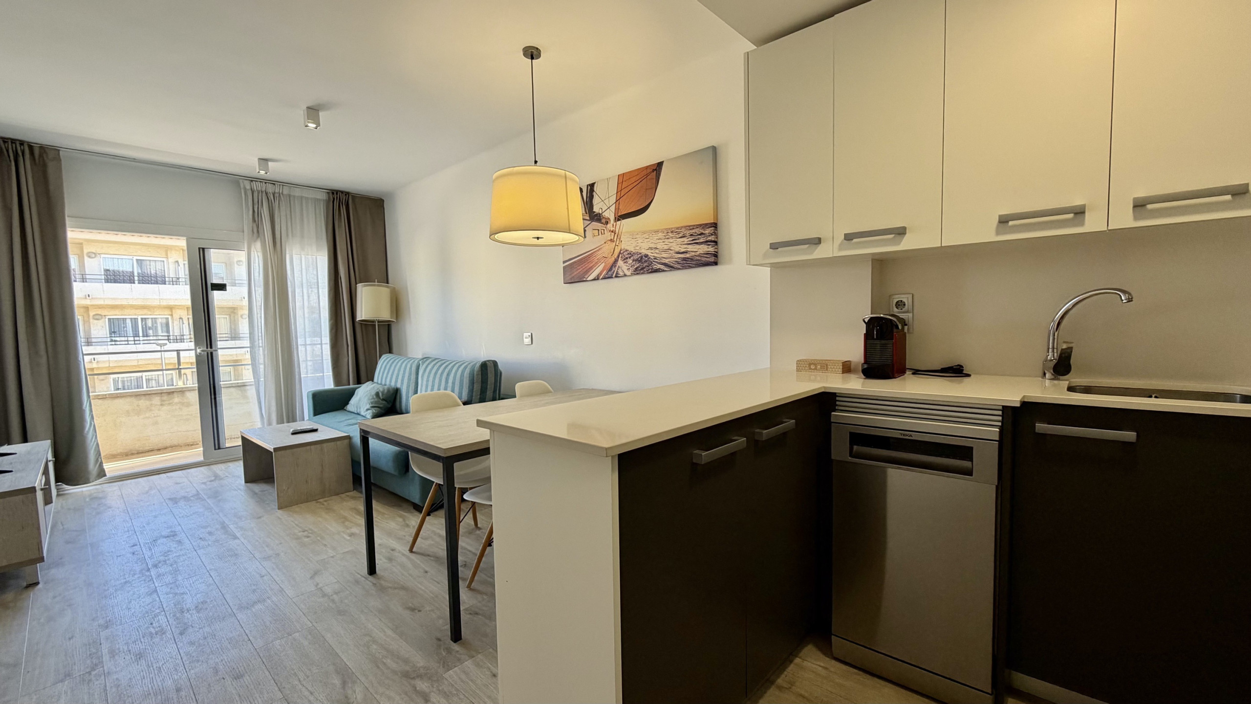 In der Anlage Rocamaura steht diese Ein-Zimmer-Wohnung für Ferienvermietung zur Verfügung. Sie verfügt über ein Doppelstockbett und ein Einzelbett und bietet Platz für bis zu 3 Personen. Die Wohnung umfasst ein Wohn-Esszimmer mit Sofa und Fernseher, eine kleine separate Küche und ein Badezimmer mit Dusche.