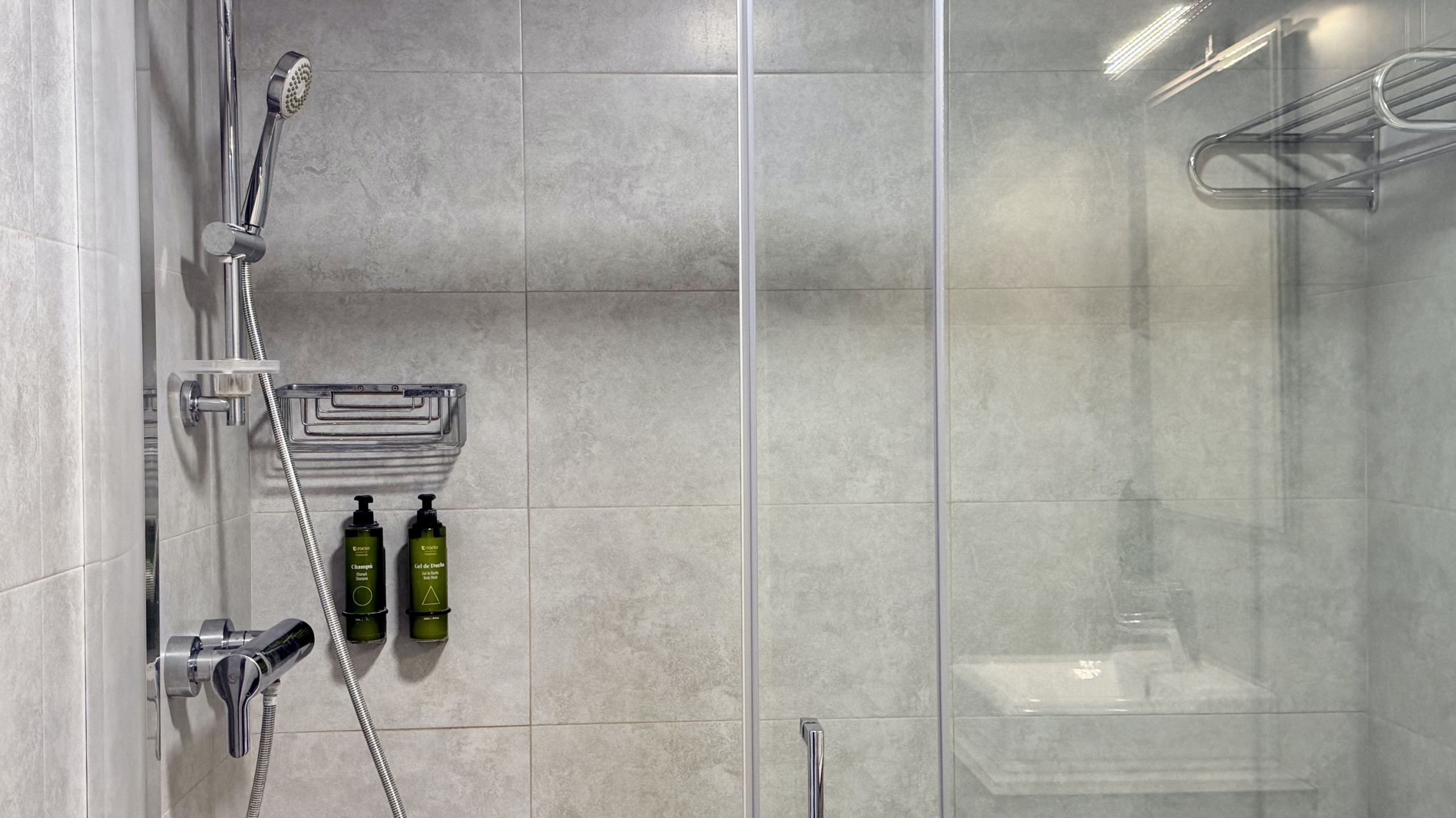 Das Schlafzimmer bietet zwei Einzelbetten, die zusammengeschoben werden können und somit Flexibilität für verschiedene Ruhekonfigurationen bieten. Zusätzlich verfügt es über ein Schlafsofa, das dem Raum noch mehr Vielseitigkeit verleiht. Das Badezimmer mit Dusche vervollständigt Ihre Komfortbedürfnisse.